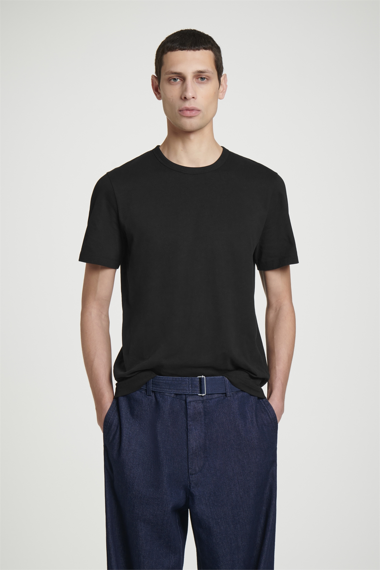 Футболка стала краеугольным камнем нашей коллекции с самого первого дня - и не зря. Она изготовлена из хлопка-джерси плотностью 160 г, который обладает роскошной мягкостью и достаточно легок для многослойности. Она выполнена в черном цвете и имеет классическую форму, которая хорошо сидит и не стесняет движений в области груди и рук. Regular fit, 160gsm Ребристая круглая горловина, короткие рукава Аккуратная двойная строчка Оболочка: 100% хлопок. Без учета отделки / Машинная стирка Длина спины размера M составляет 70 см / Модель носит размер M