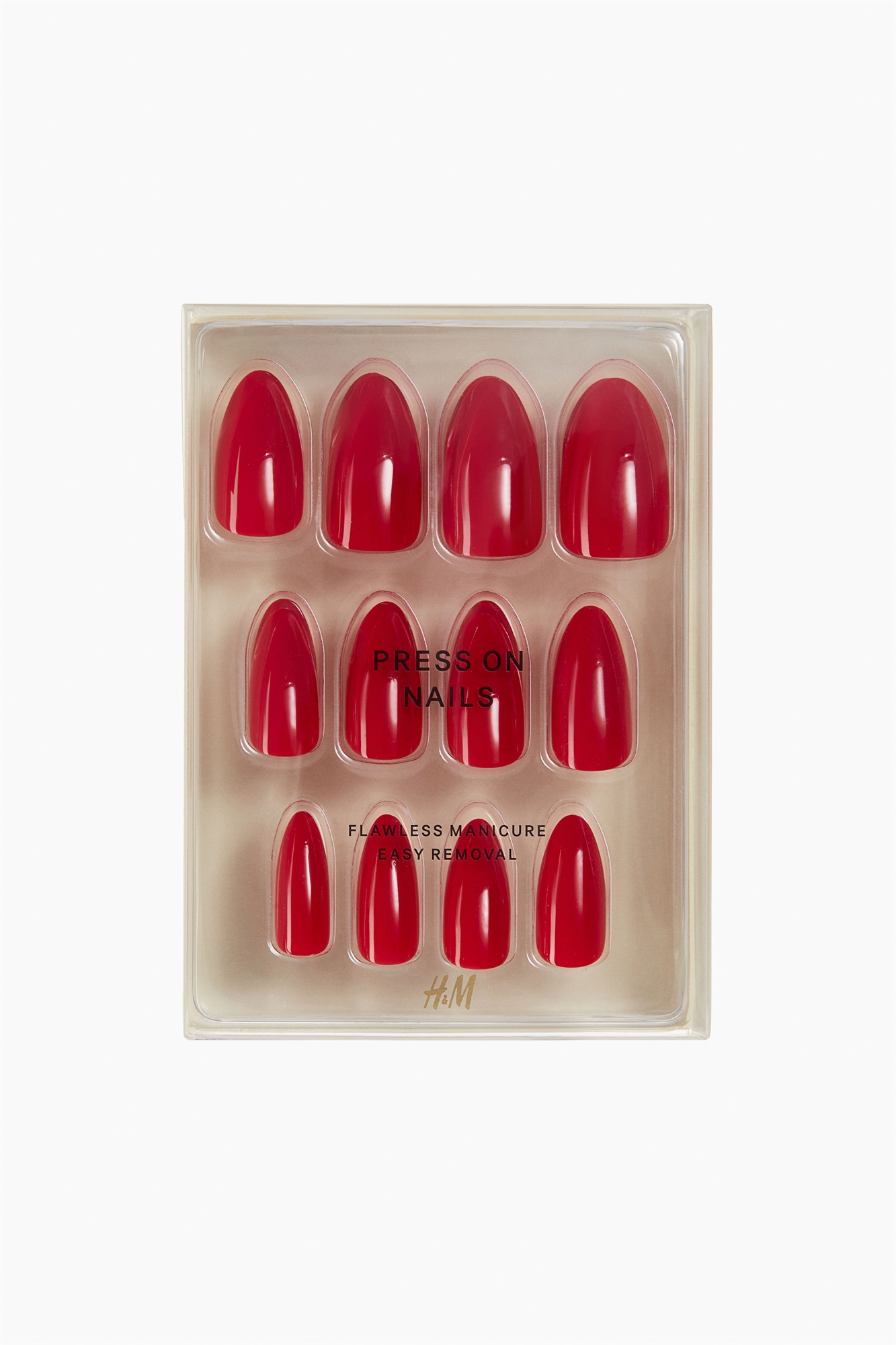 Выбор накладных ногтей, предварительно приклеенных, ярких цветов и смелых дизайнов.