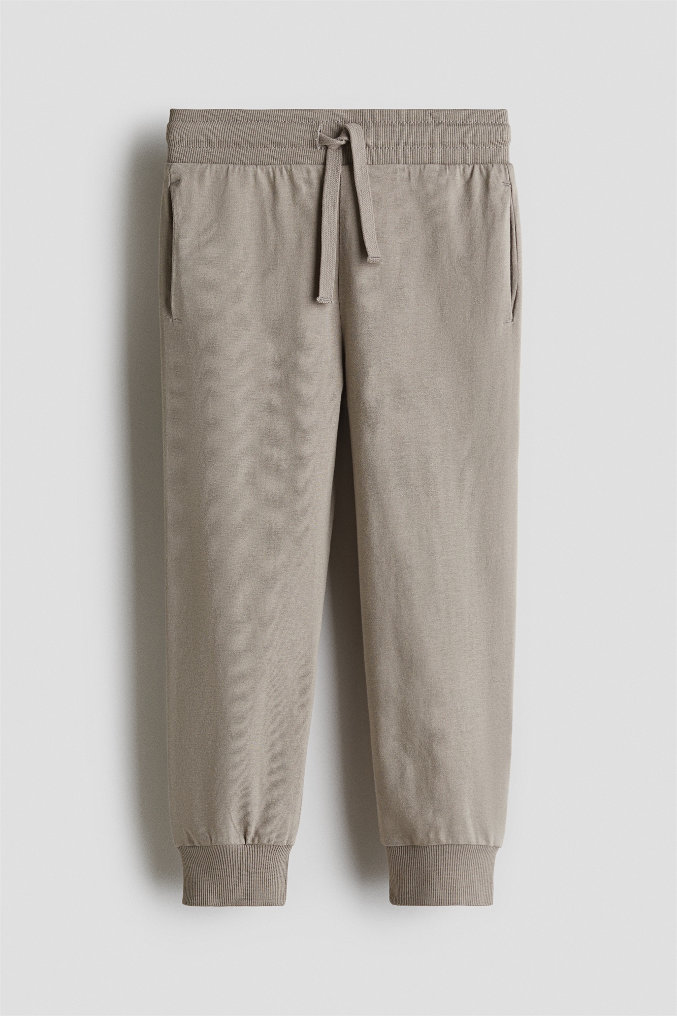 Джоггеры из легкого джерси из смеси хлопка с эластичным поясом в рубчик, карманами в боковых швах и ребристыми краями.