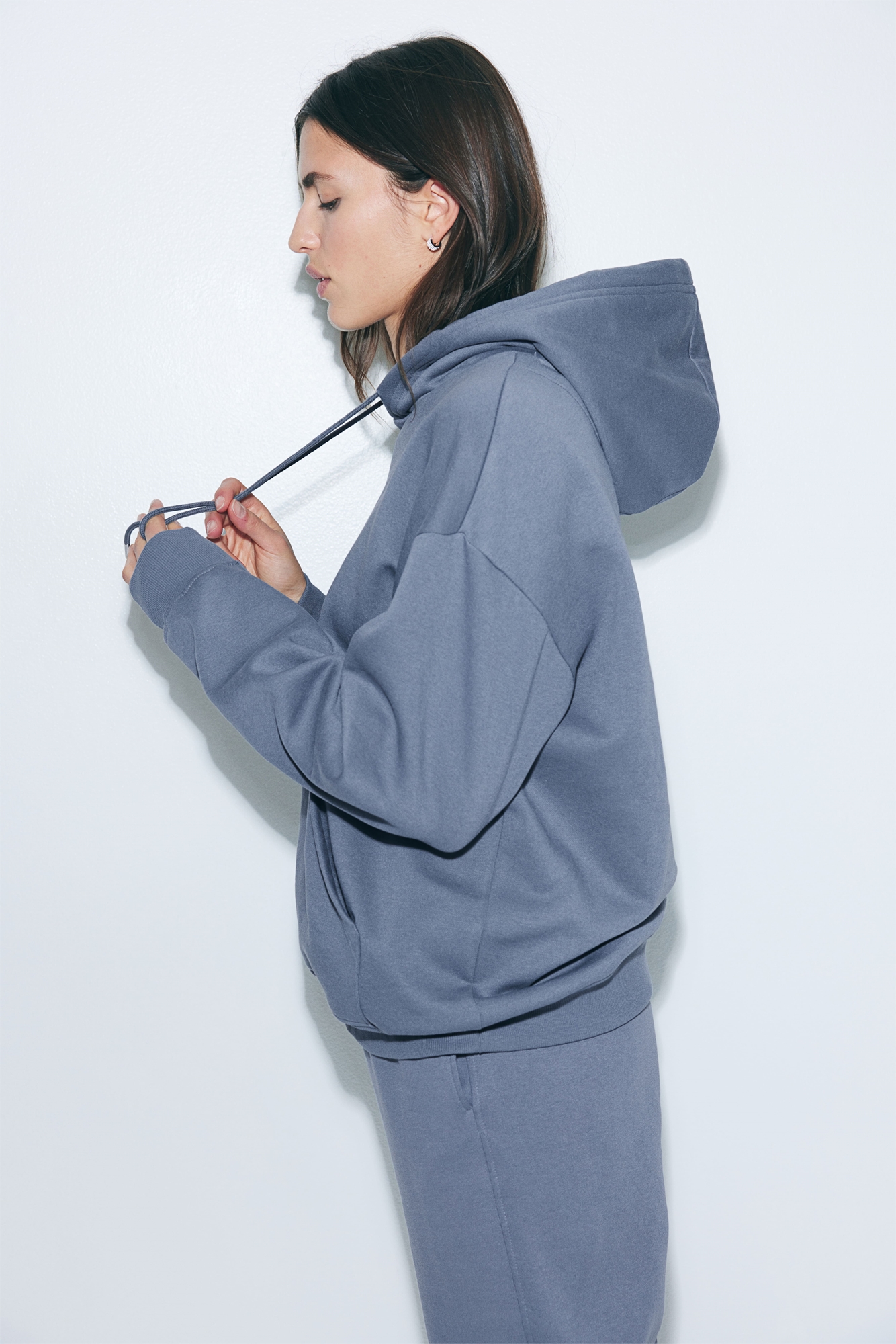 Широкий топ из толстовочной ткани с капюшоном на подкладке, карманом-кенгуру, манжетами и подолом в рубчик.