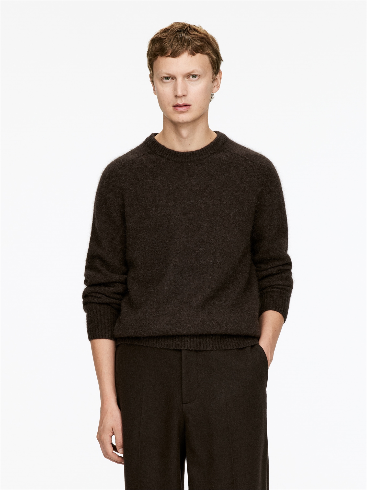 Джемпер с круглым вырезом и уютной ворсистой поверхностью. В пряжу добавлены полиэстер и эластан для придания легкости и прочности.