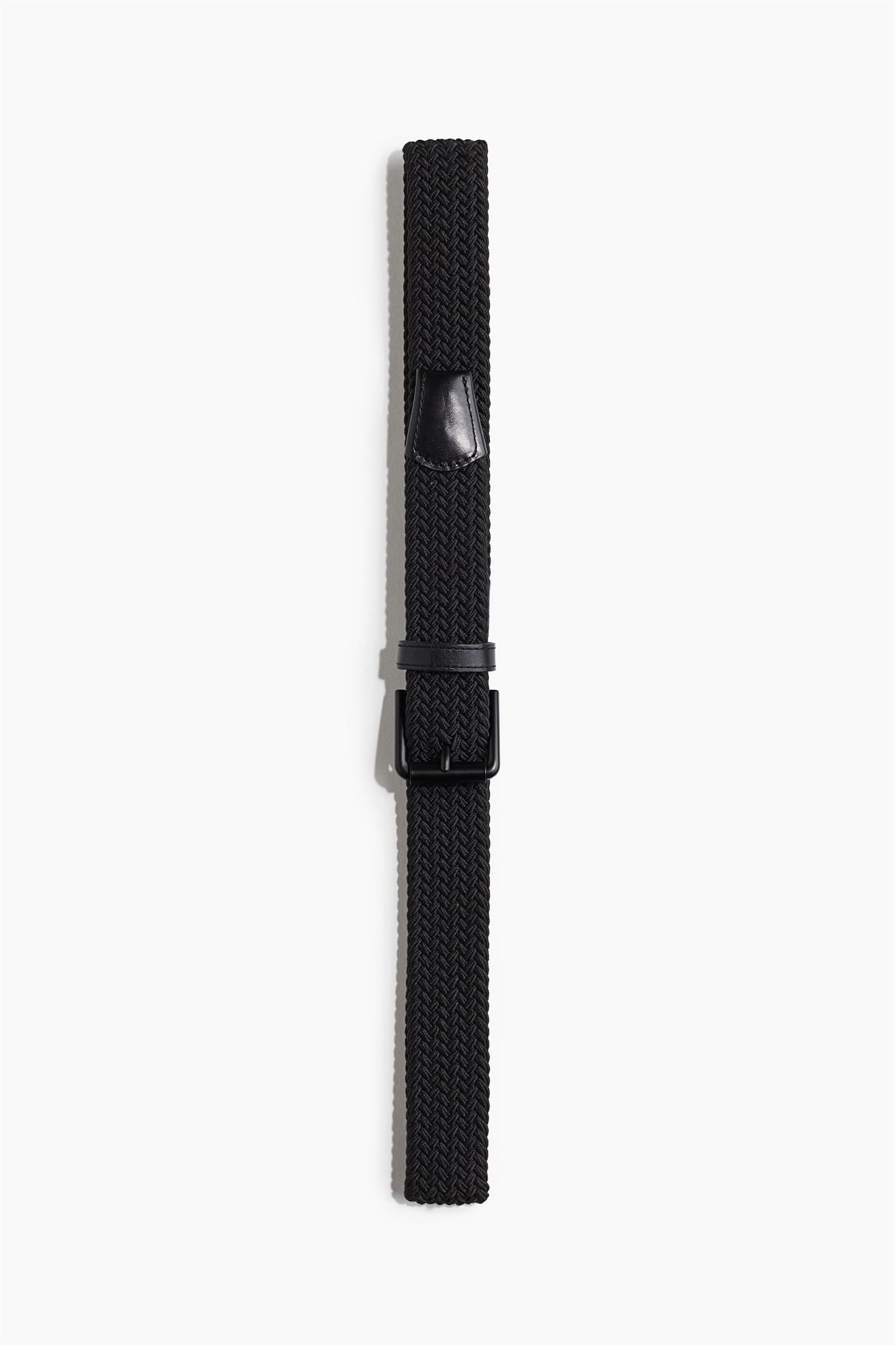 Плетеный ремень из эластичной ткани с деталями из искусственной кожи и металлической пряжкой. Ширина ок. 3,5 см.