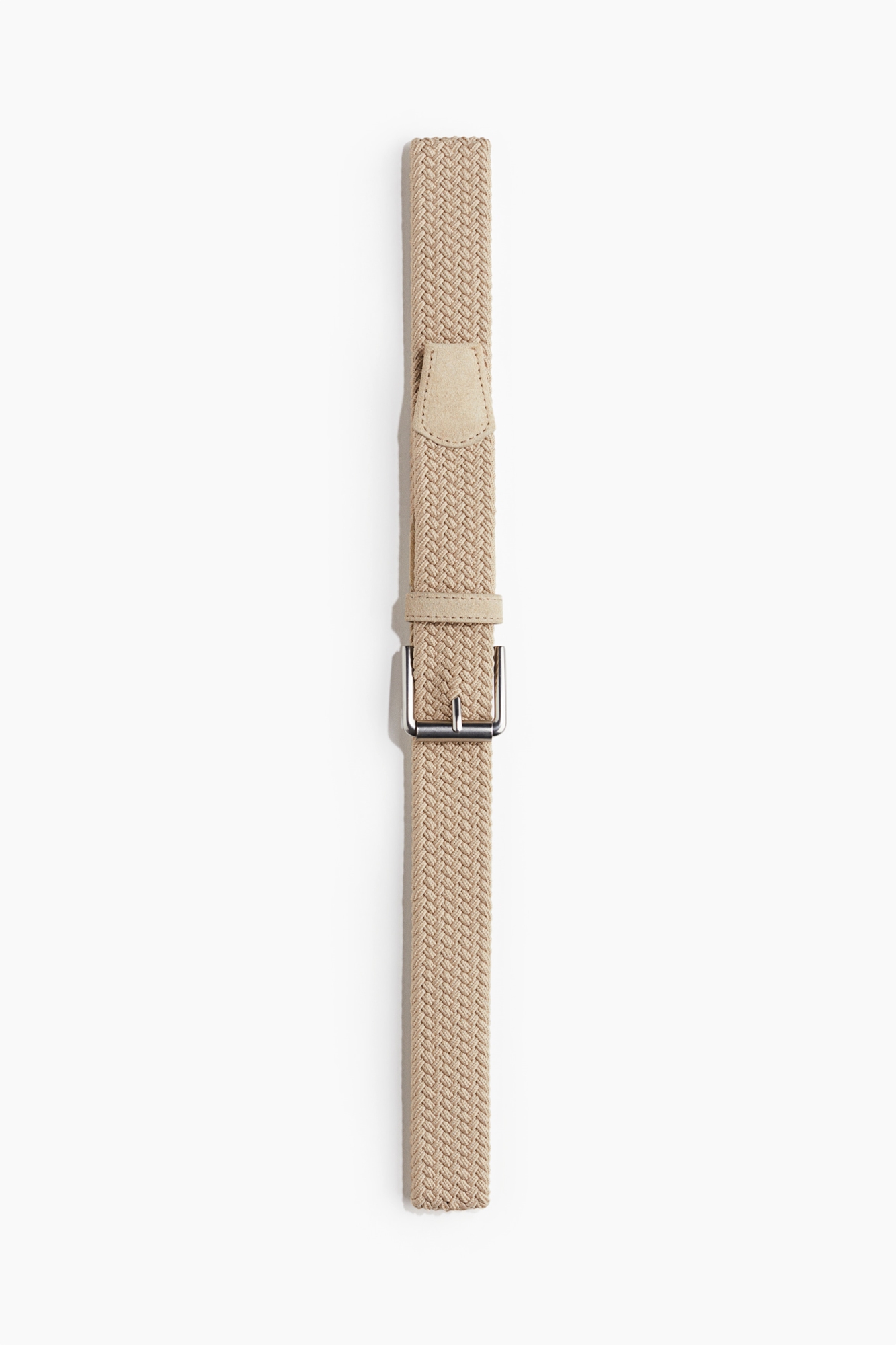 Плетеный ремень из эластичной ткани с деталями из искусственной кожи и металлической пряжкой. Ширина ок. 3,5 см.