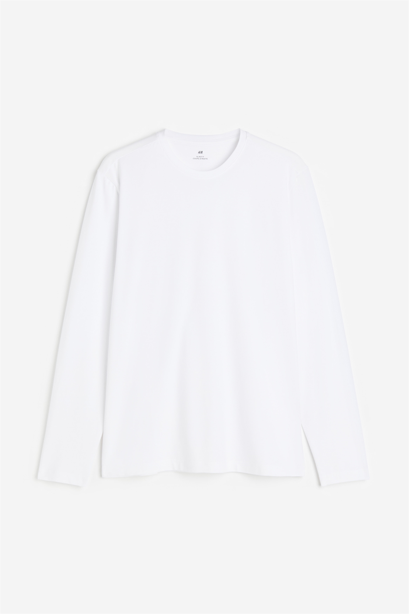 Рубашка из легкого хлопкового микса с круглым ребристым вырезом, длинными рукавами и прямым подолом. Облегающий крой - это крой, который подстраивается под контуры тела и создает стройный силуэт.