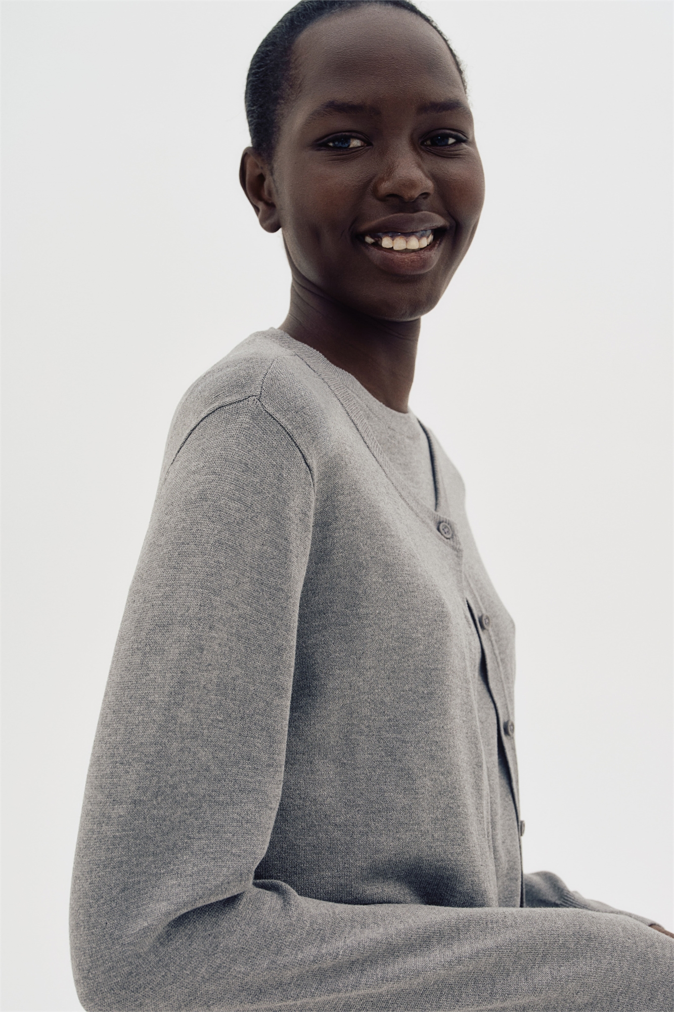 Кардиган из мягкой вискозы тонкой вязки с пуговицами спереди и отделкой в рубчик по вырезу горловины, манжетам и подолу.