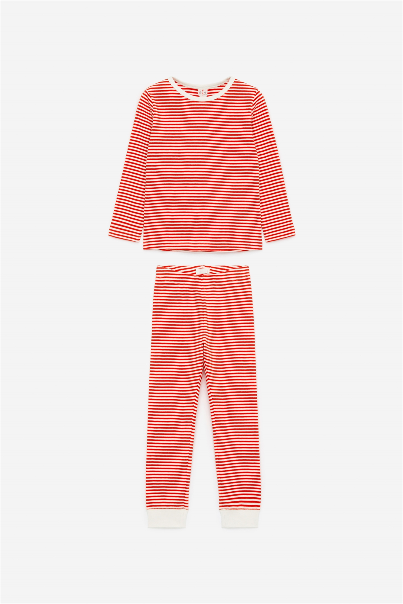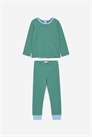 Эта пижама из двух частей, сшитая из мягкой ткани джерси, изготовлена из хлопка. Пижама с вырезом горловины и длинными рукавами и брюки с эластичной талией. Ребристые манжеты на рукавах и ногах.