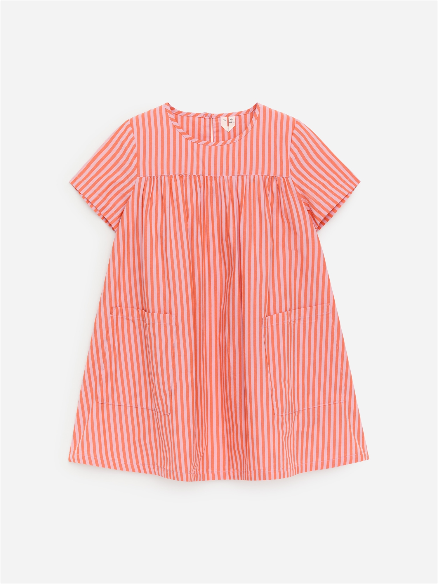 Это летнее платье сшито из мягкой хлопковой ткани поплин. Короткие рукава и объемный силуэт придают платью воздушность. В верхней части, как спереди, так и сзади, имеется складка. Спереди два накладных кармана, а сзади на горловине отверстие для ключа с застежкой на пуговицу. Без подкладки.