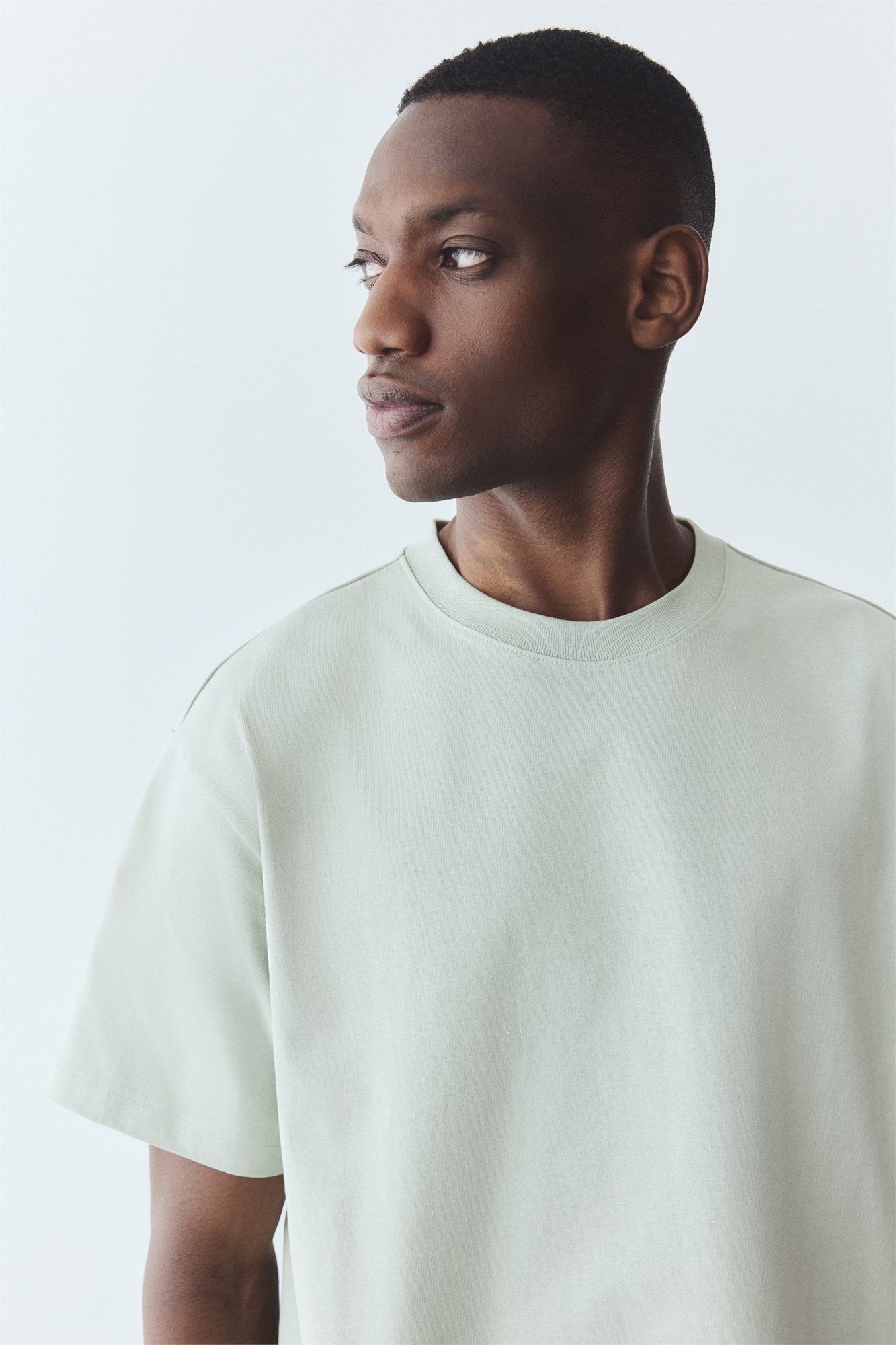 Футболка из плотного хлопкового джерси с круглым вырезом в рубчик, спущенными плечами и прямым покроем. Свободный крой для объемного, но не чрезмерно большого силуэта.