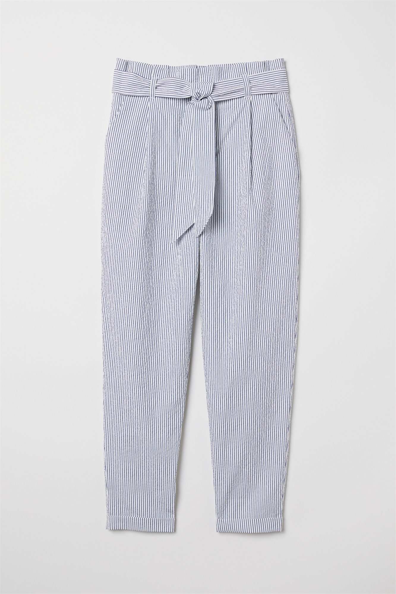 Плиссированные брюки длиной 7/8 из фактурной ткани в полоску. Брюки имеют высокий пояс из бумажного мешка со складками и съемный пояс с завязками. Боковые карманы, декоративные накладные карманы сзади и прямые, зауженные ноги с фиксированными подворотами.