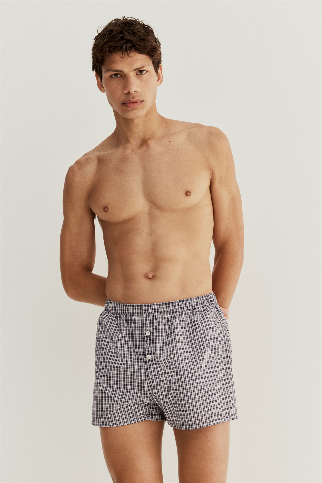 Удлиненные семейные трусы из хлопковой ткани с эластичным поясом и пуговицами спереди.