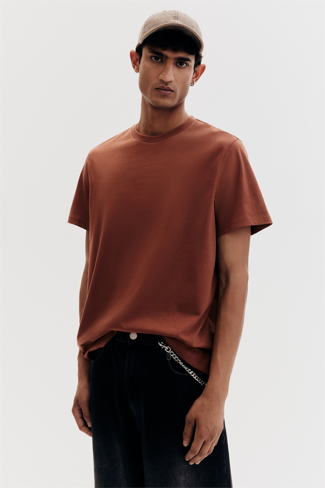 Футболка из легкого хлопкового джерси с круглым вырезом в рубчик и прямым покроем. Регулярный крой для комфортной носки и классического силуэта.