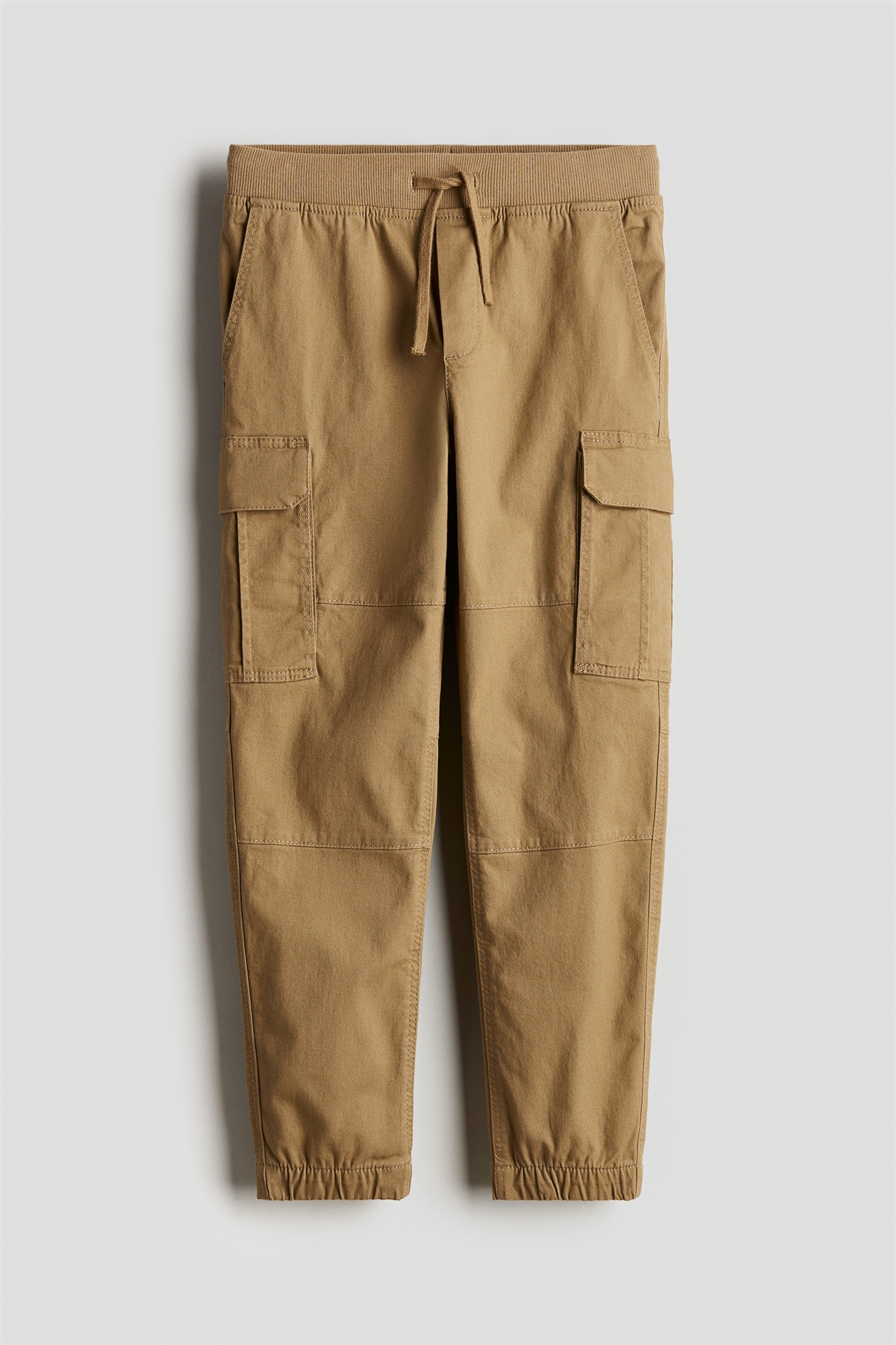 Брюки-карго из эластичной хлопковой саржи с утягивающим поясом и фальшивой ширинкой. Боковые карманы, накладные карманы на ногах с застежкой на крючок и петлю и фальшивые задние карманы. Зауженные ноги с ребристыми краями.