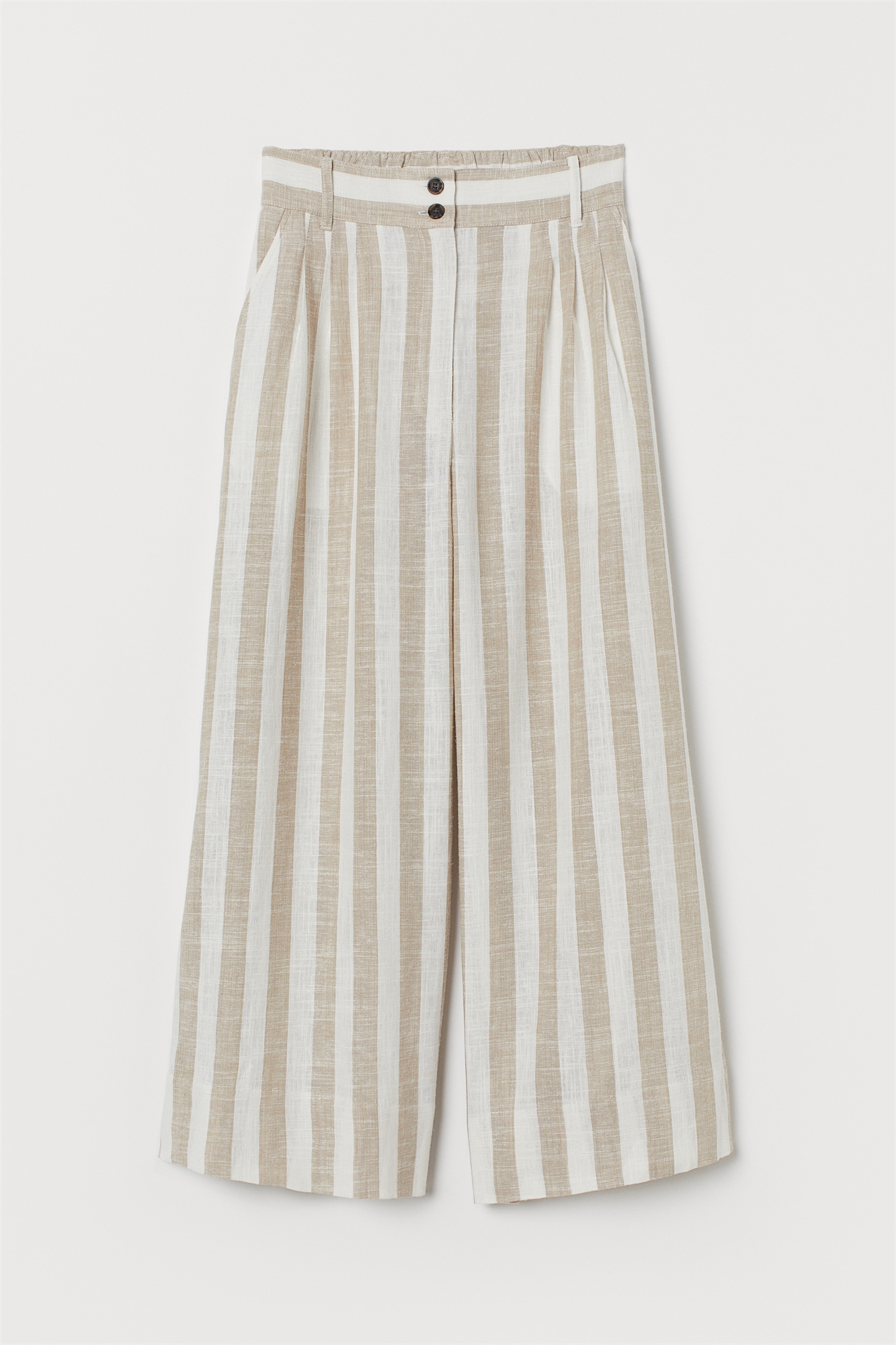 Плиссированные брюки длиной 7/8 из смеси льна и вискозы. Модель с высоким поясом, прямыми широкими ногами, боковыми карманами и декоративной отделкой сзади. Эластичный пояс сзади, застежка на молнию и пуговицы спереди.