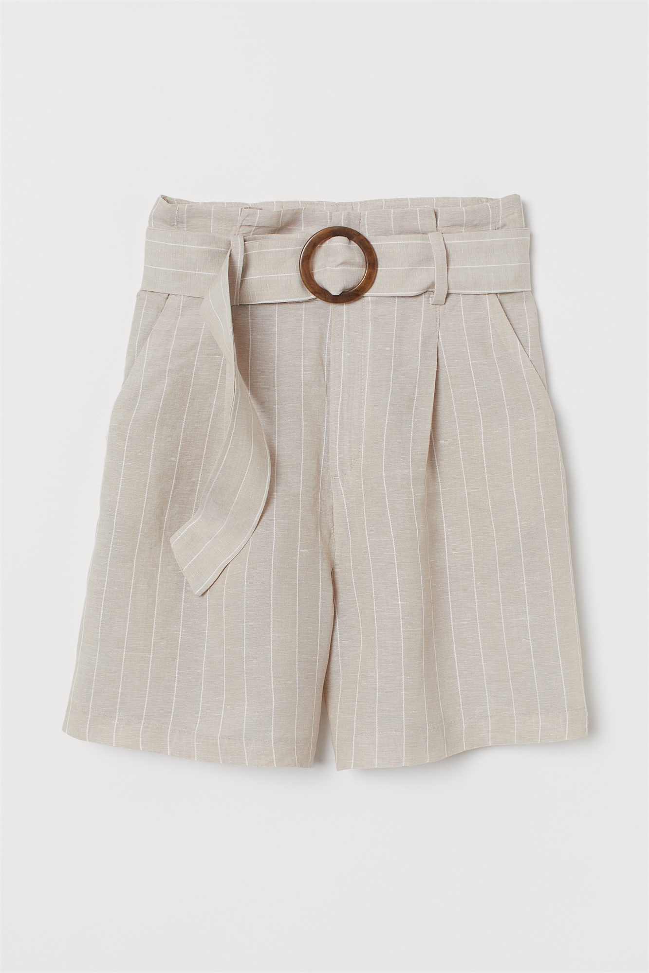 Шорты из смеси лиоцелла и лайна Tencel™ с высоким поясом и широким ремнем с круглой пряжкой спереди. Плиссировка и потайная застежка-молния спереди. Боковые карманы и короткая, широкая штанина.