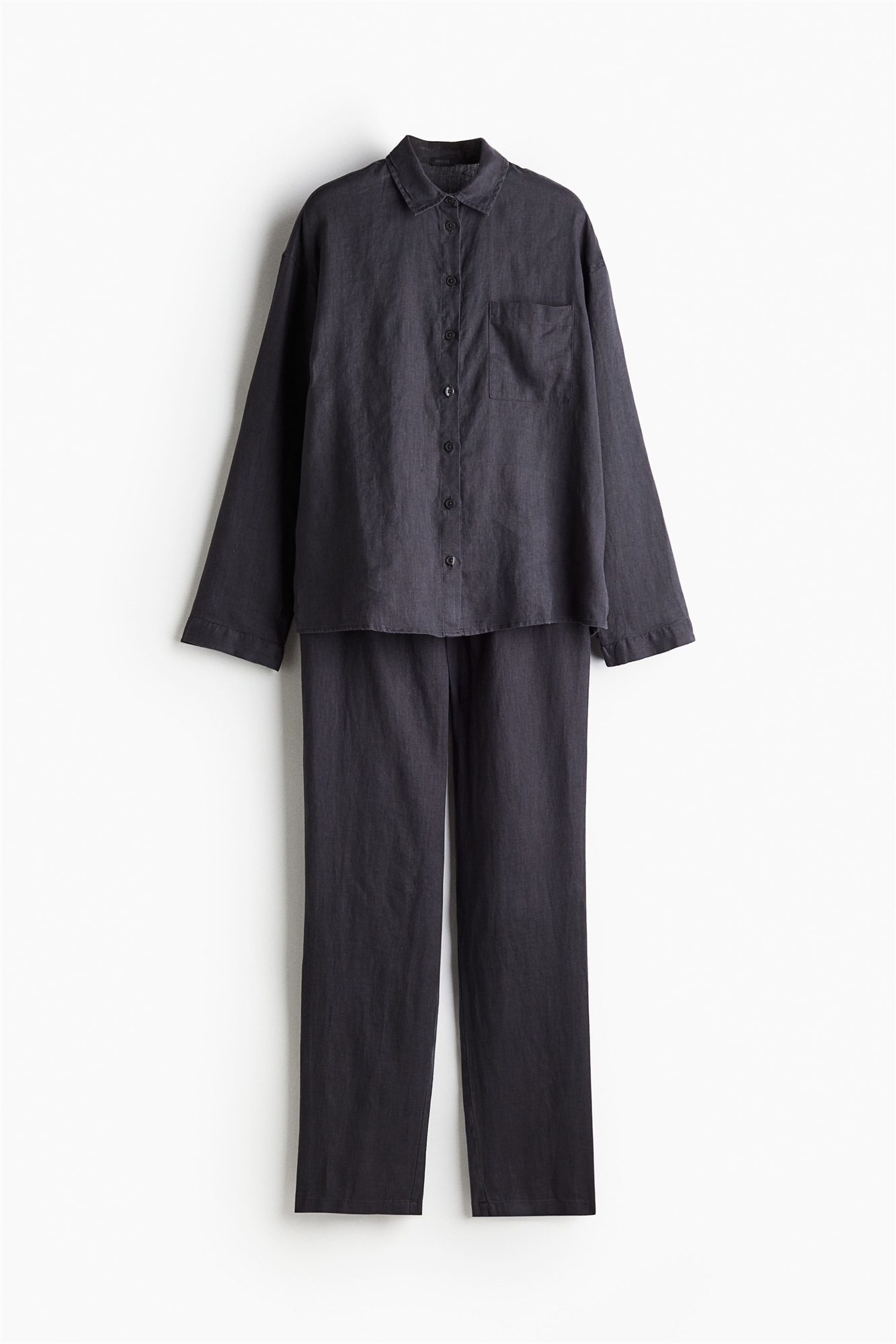 Пижама с рубашкой и нижней частью из стираного льна. Рубашка с отложным воротником, пуговицами спереди и открытым нагрудным карманом. Широкие штанины с эластичной отделкой и завязкой на талии.