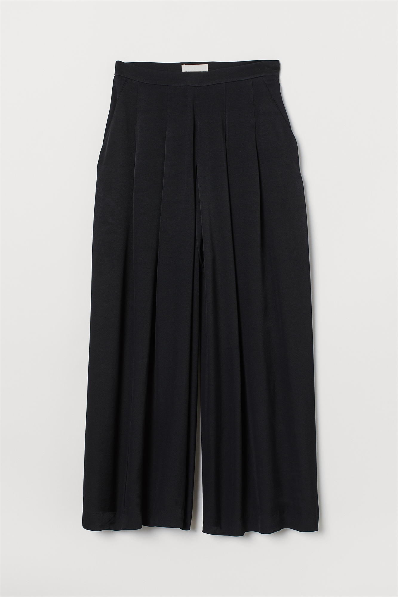 Плиссированные брюки из вискозы с широкими прямыми штанинами длиной 3/4. Модель с высоким поясом, боковыми карманами и потайной застежкой-молнией сбоку.