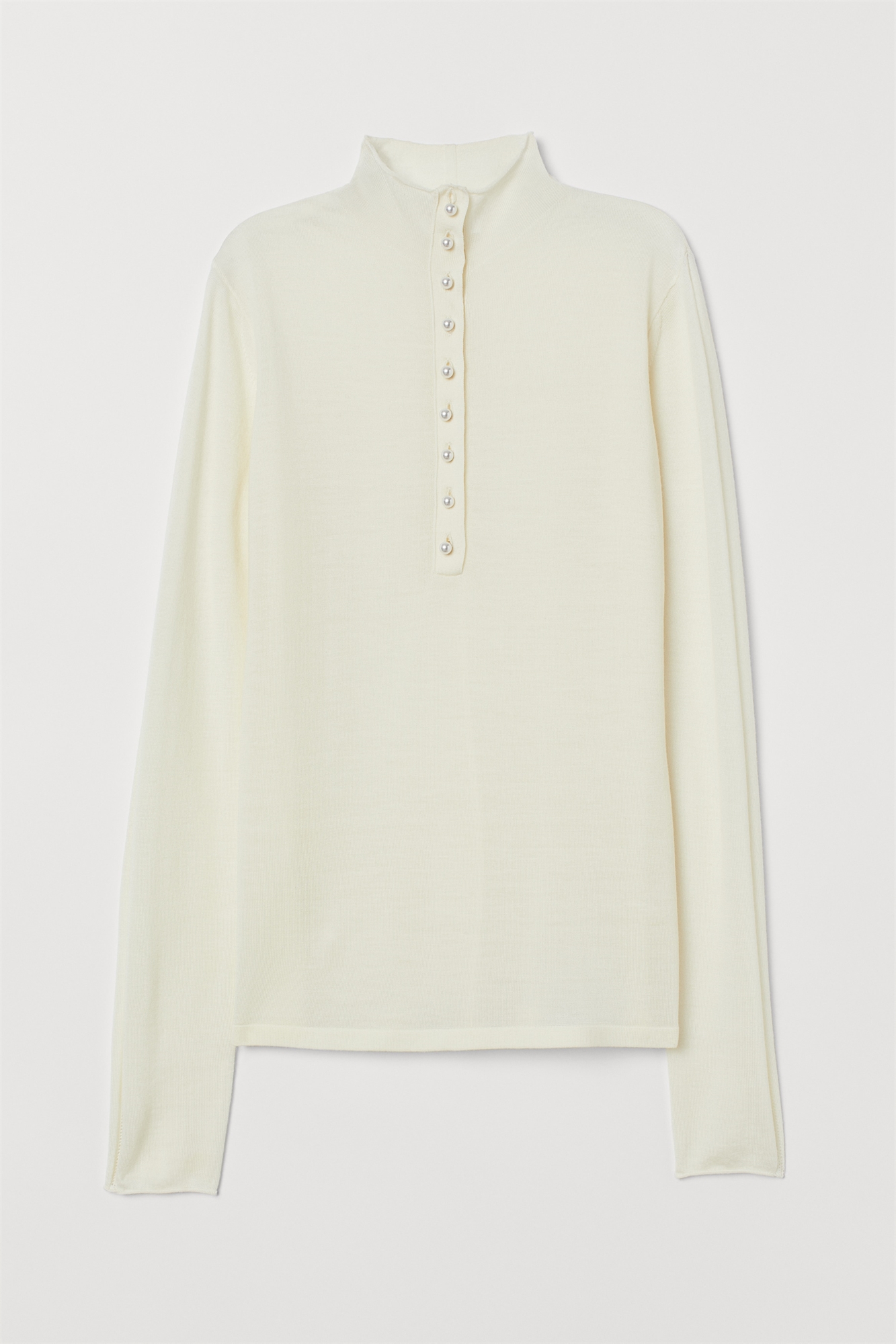 Тонкий, облегающий фигуру джемпер тонкой вязки из мягкой мериносовой шерсти. Воротник-стойка с закатанным краем и застежкой на пуговицы в верхней части с мерцающими перламутровыми пуговицами. Длинные рукава с декоративной перфорацией на манжетах. Узкая ребристая отделка по подолу.