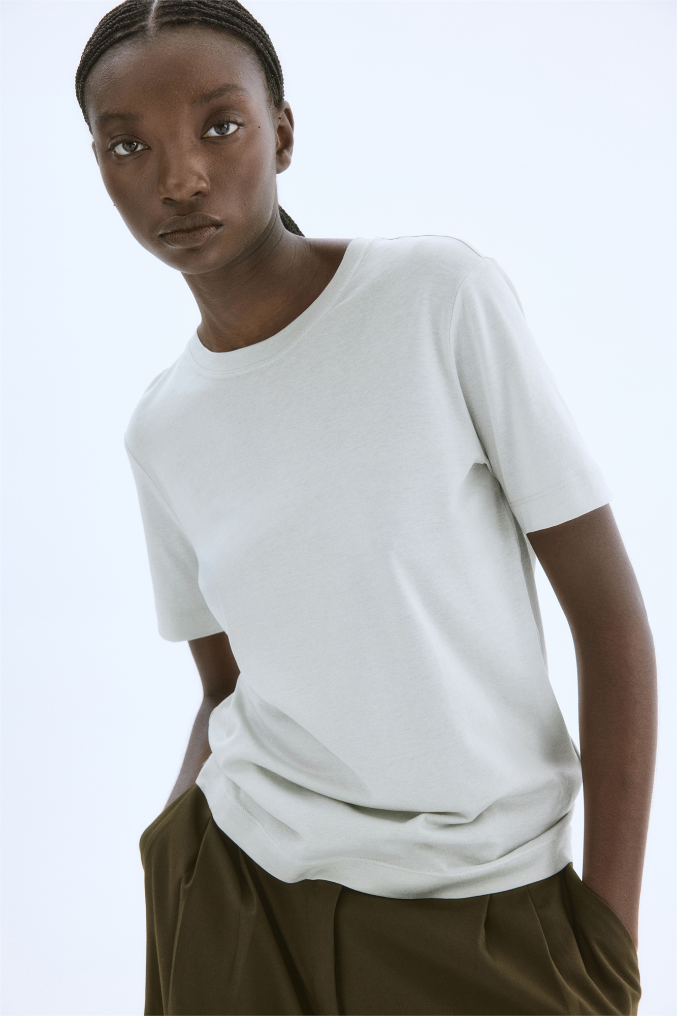 Классическая футболка из мягкого, нежно драпирующегося трикотажа, выполненного из смеси хлопка и шелка. Прямой покрой с короткими рукавами.