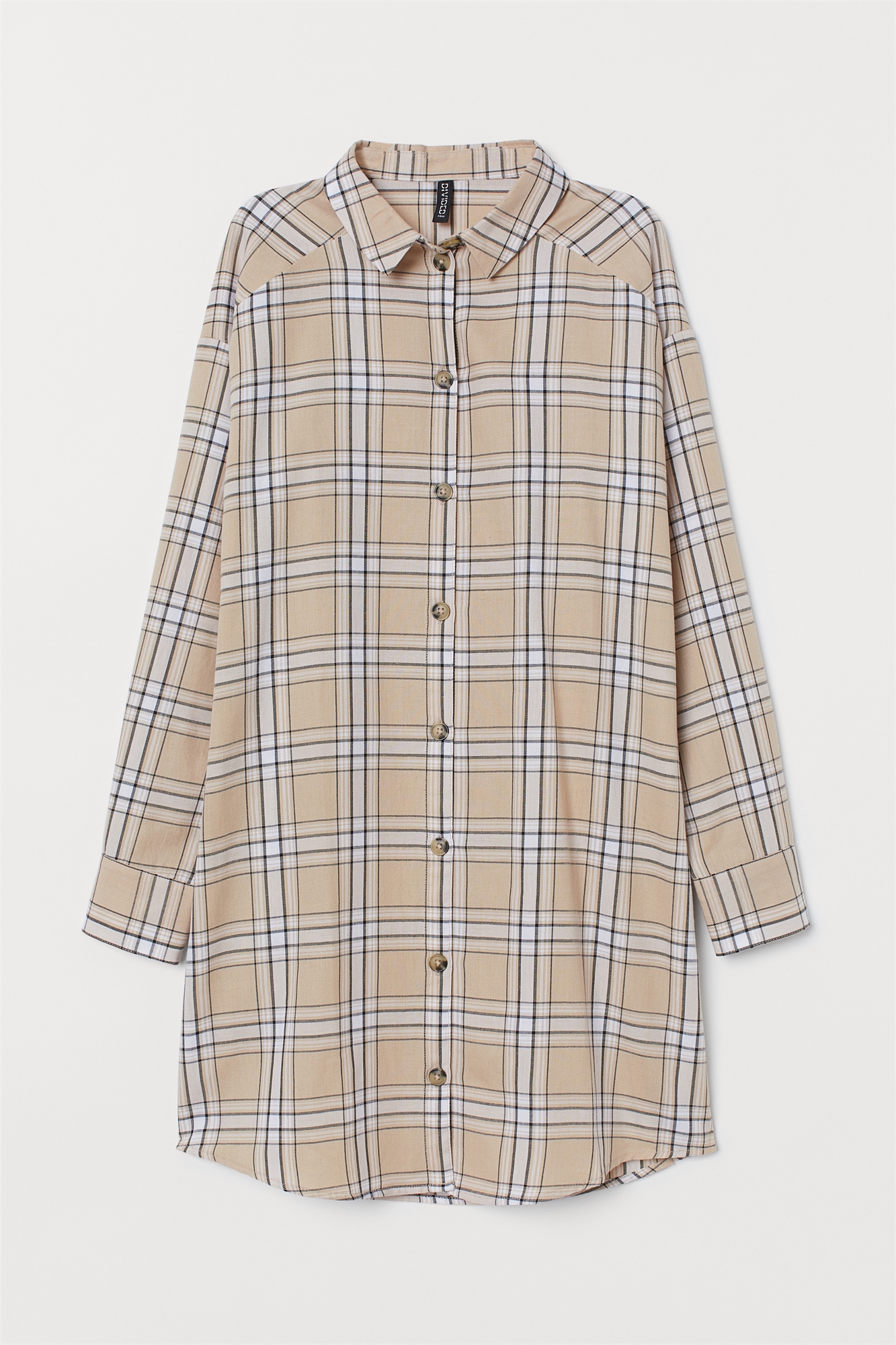 Короткое платье-блузка из узорчатой креповой ткани с воротником, передним и задним ярмом и застежкой на пуговицы спереди. Длинные рукава с манжетами на пуговицах. Закругленный подол.