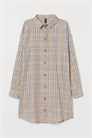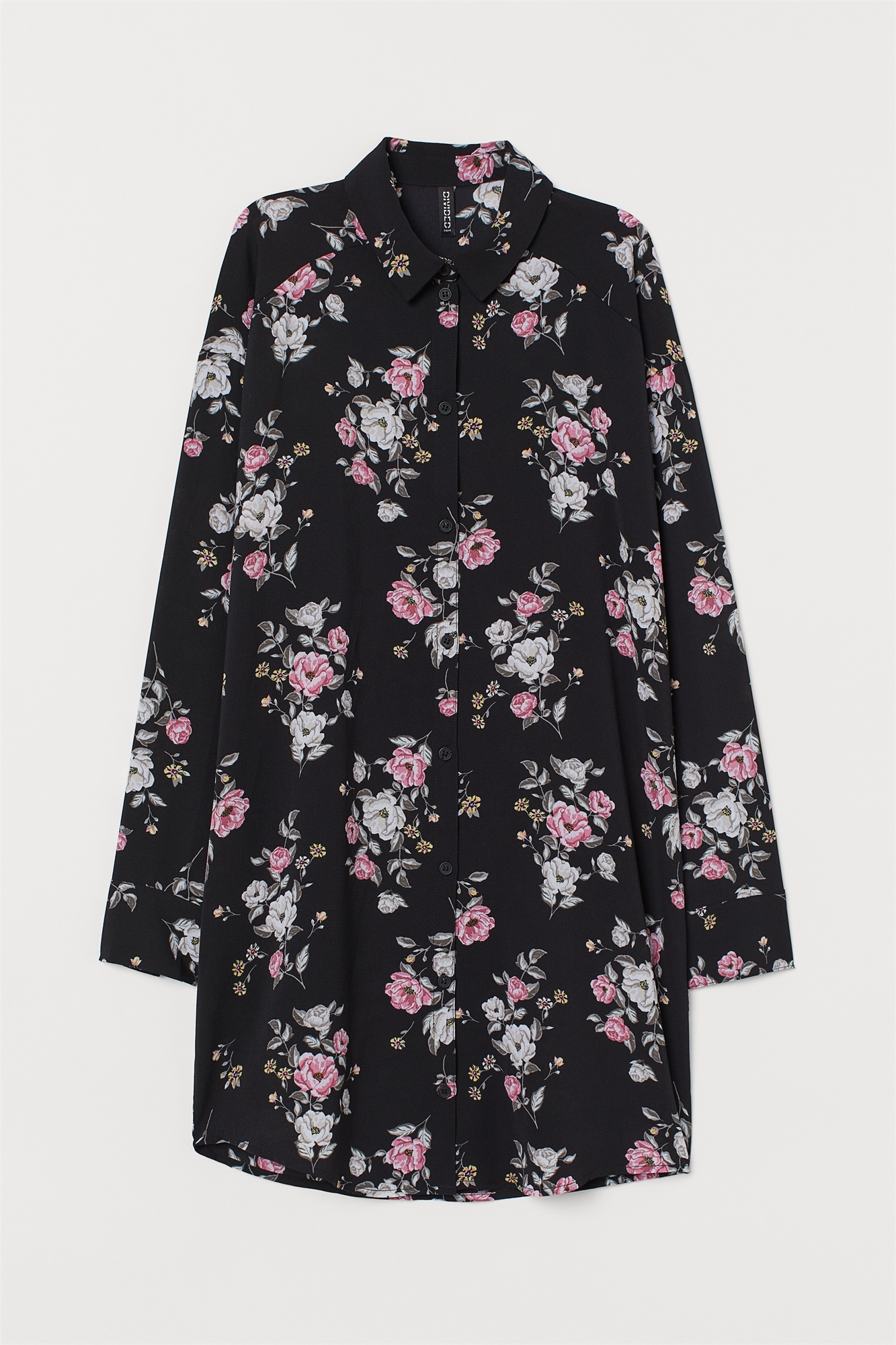 Короткое платье-блузка из узорчатой креповой ткани с воротником, передним и задним ярмом и застежкой на пуговицы спереди. Длинные рукава с манжетами на пуговицах. Закругленный подол.