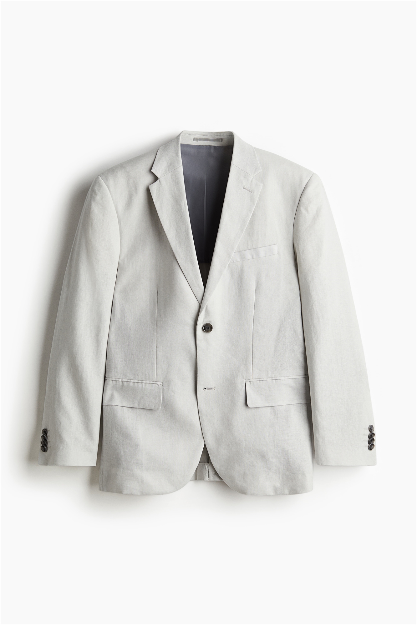 Однобортный пиджак из льняного полотна с узкими лацканами с вырезом, декоративной петлей для пуговиц, нагрудным карманом, накладными передними карманами и двумя внутренними карманами. Зауженный крой с двумя пуговицами спереди, декоративными пуговицами на манжетах и одним вентиляционным отверстием сзади. На подкладке. Ткань из льна хорошо пропускает воздух, прекрасно гладится и мнется, а также смягчается со временем.