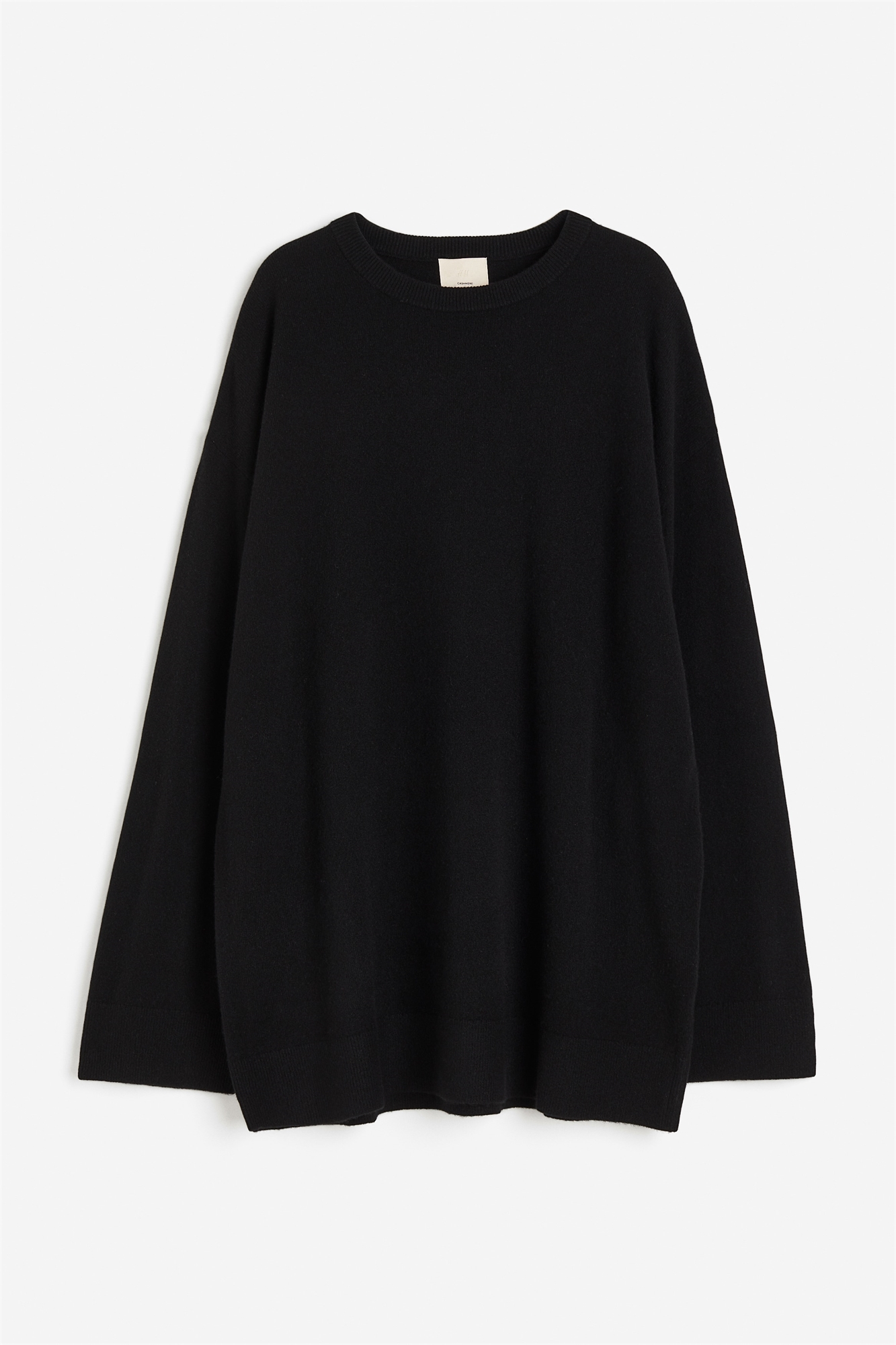 Джемпер оверсайз из мягкого кашемира тонкой вязки с опущенными плечами, длинными широкими рукавами и окантовкой по вырезу горловины, манжетам и подолу.