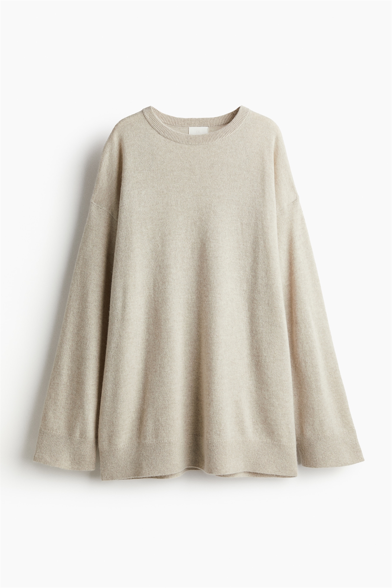 Джемпер оверсайз из мягкого кашемира тонкой вязки с опущенными плечами, длинными широкими рукавами и окантовкой по вырезу горловины, манжетам и подолу.