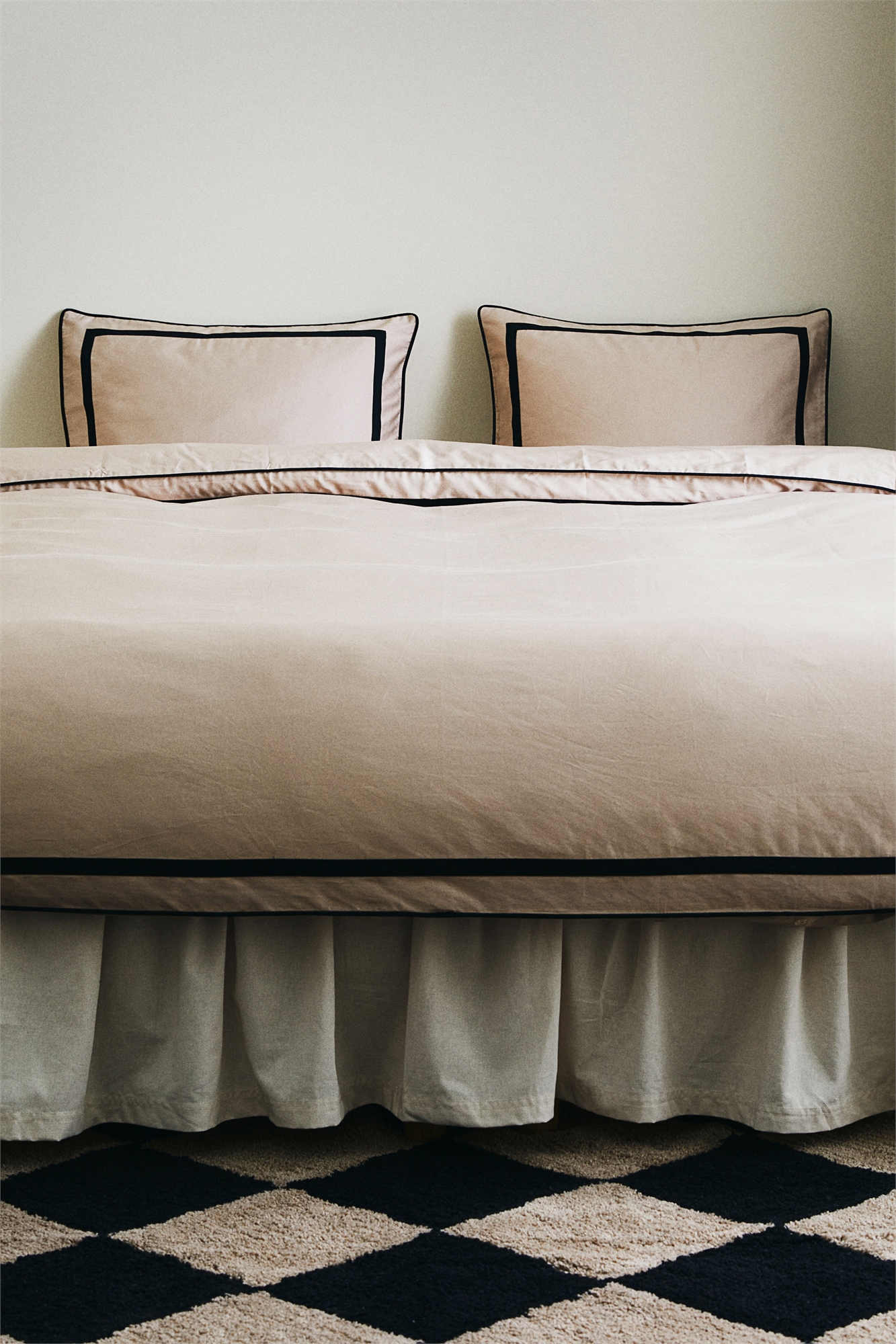 Двуспальный комплект постельного белья из тонкопористого, плотного сатина из египетского хлопка с количеством нитей 400. Пододеяльник застегивается снизу на потайные пуговицы. Две наволочки с отверстием-конвертом. Окантовка контрастного цвета.