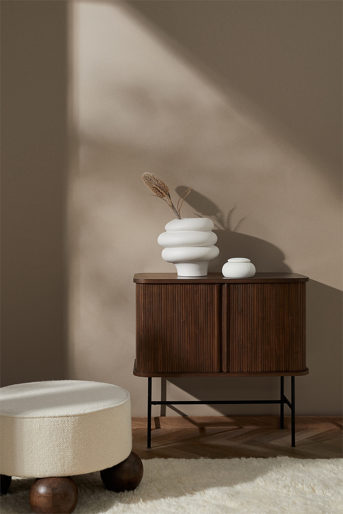 Шкаф из МДФ с лакированным шпоном ясеня, закругленными углами и жалюзийными дверцами из сосны. Регулируемая полка и окрашенные металлические ножки. Легко собирается, шурупы входят в комплект. Глубина 36 см. Ширина 80 см. Высота 77 см. Вес 16 кг.
