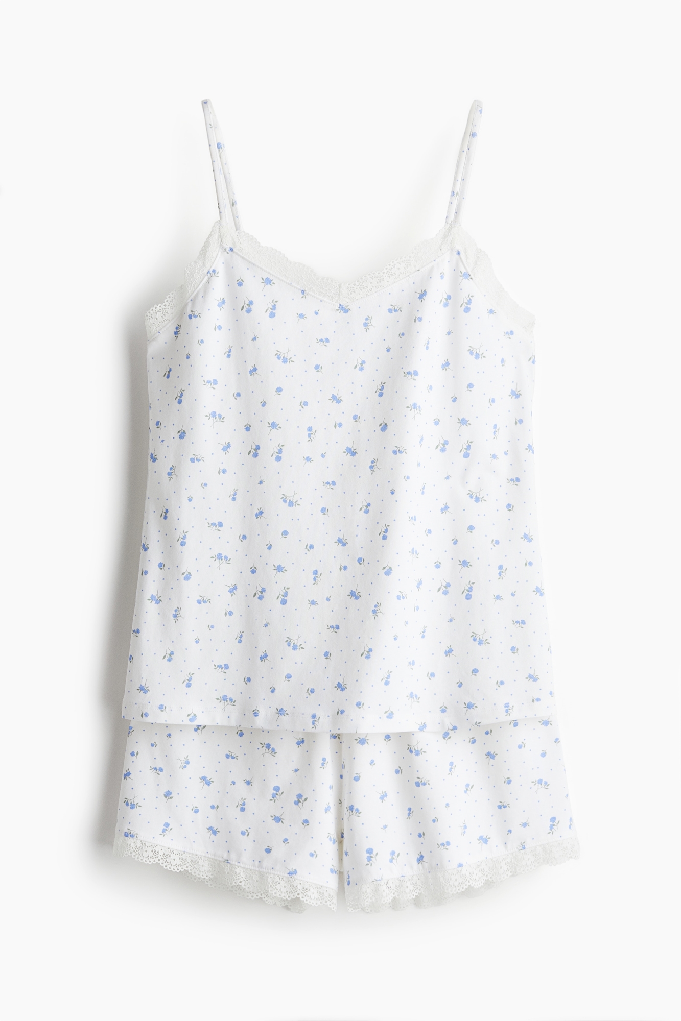 Пижама с топом на бретелях и шортами из мягкого хлопкового джерси с кружевными деталями. Топ с нежным V-образным вырезом и узкими регулируемыми бретелями. Шорты с эластичной резинкой на талии.