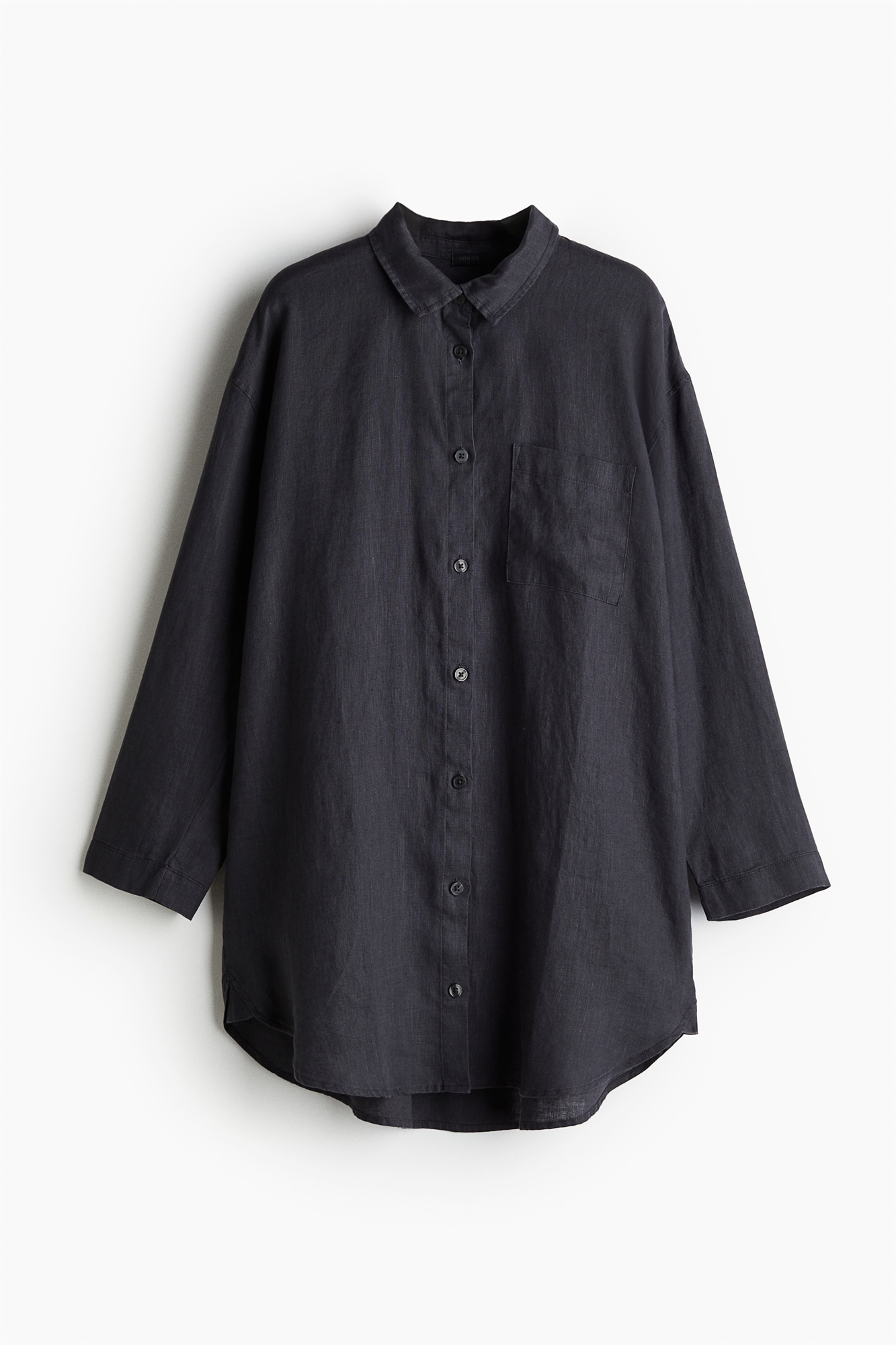 Длинная ночная рубашка из стираного льна с воротником и пуговицами спереди до подола. Складка сзади, спущенные плечи и длинные рукава, открытый нагрудный карман и закругленный подол.