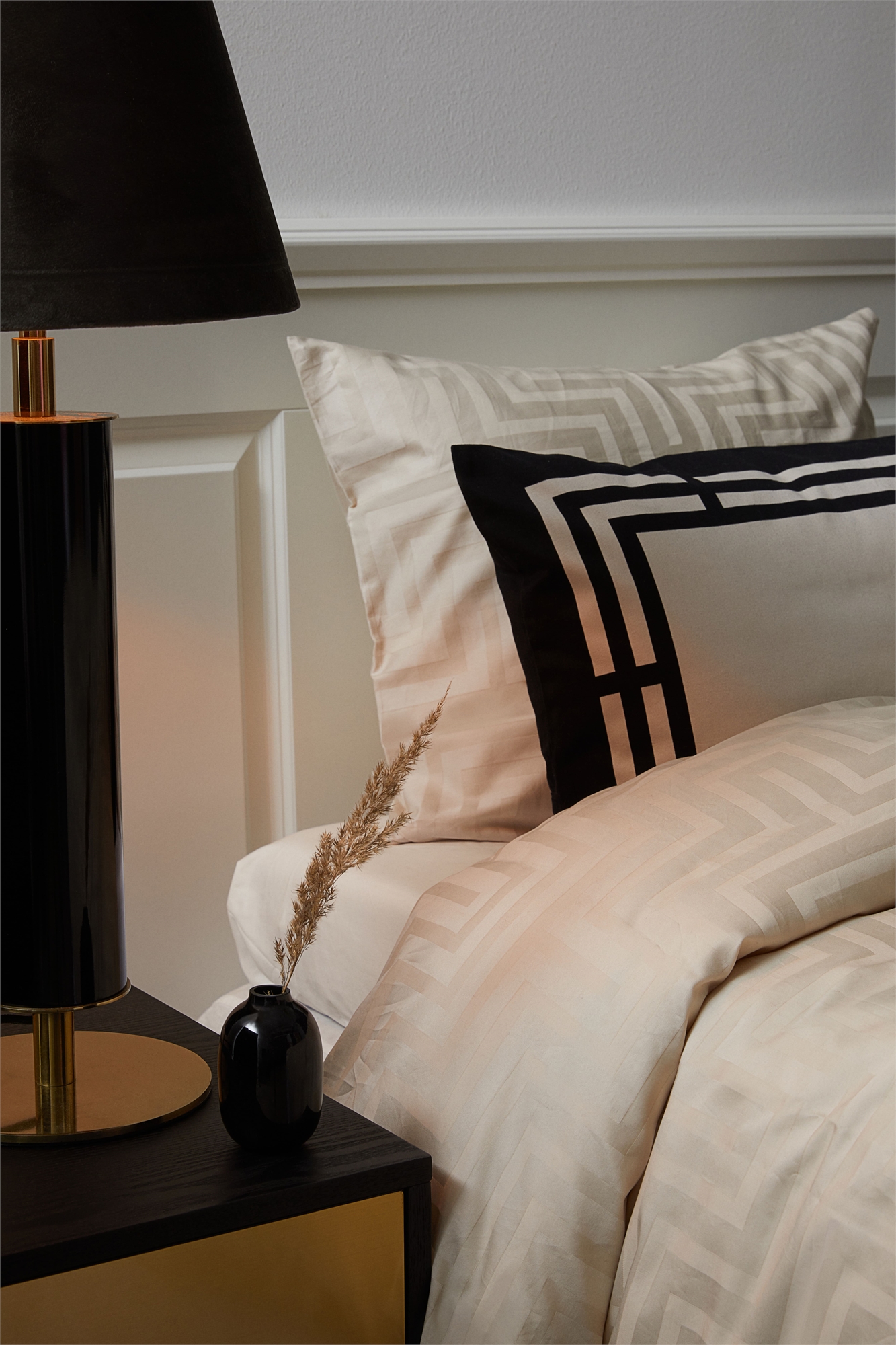 Односпальный комплект постельного белья из хлопкового сатина с жаккардовым плетением и количеством нитей 300. Пододеяльник застегивается внизу на потайные пластиковые пуговицы. Одна наволочка с отверстием конверт.