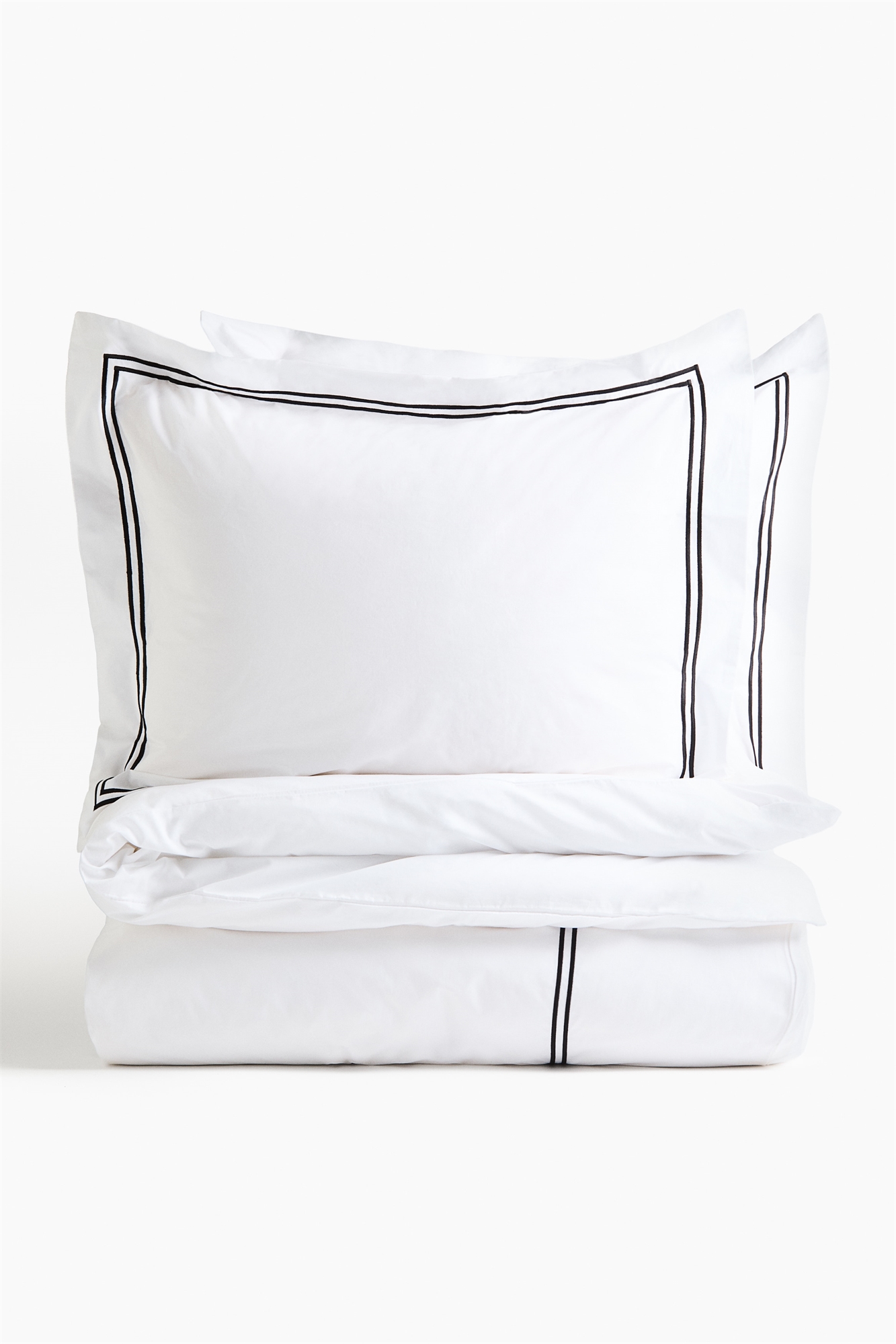 Двуспальный комплект постельного белья из хлопковой перкали с вышивкой и количеством нитей 300. Пододеяльник застегивается снизу на пуговицы. Две наволочки с отверстием для конверта.