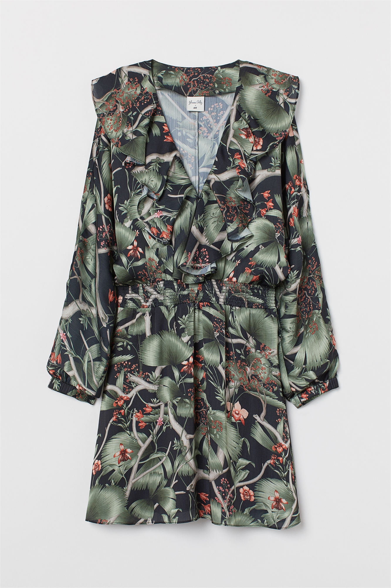 JOHANNA ORTIZ x H&M. Короткое платье из мятого тканого материала с принтом и легким блеском. Платье имеет глубокий V-образный вырез с широким воланом и застежкой на пуговицу спереди. Длинные рукава-долманы с эластичными манжетами и платочной вставкой на талии. Юбка на подкладке из джерси.