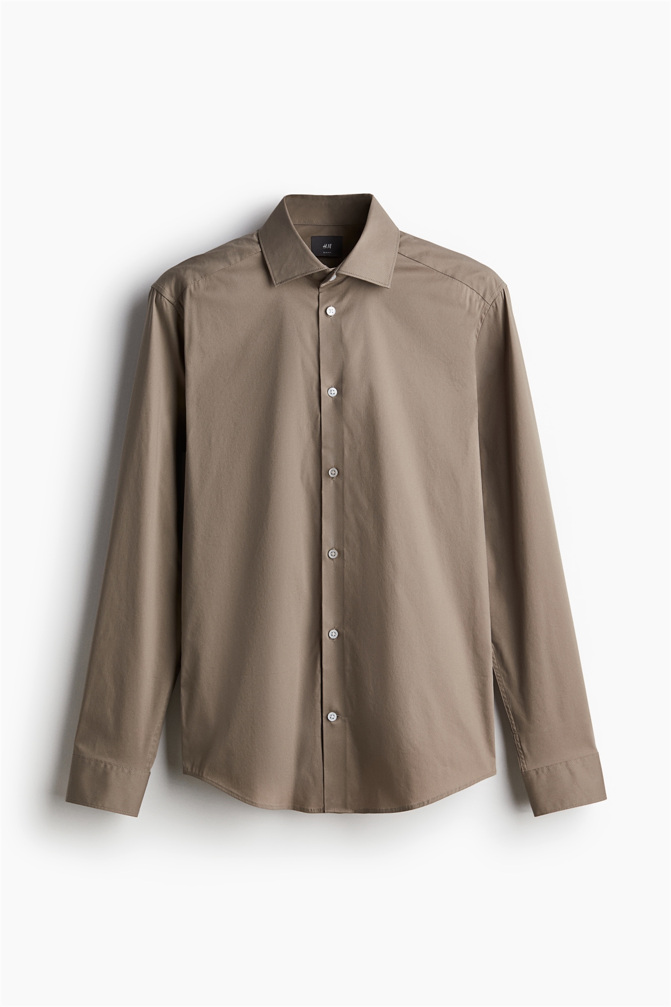 Рубашка из хлопкового микса с отложным воротником, классической передней частью и передом. Длинные рукава с регулируемыми пуговицами на манжетах и рукавной планкой с пуговицей. Аккуратный закругленный подол. Зауженный крой, облегающий контуры тела и создающий приталенный силуэт.