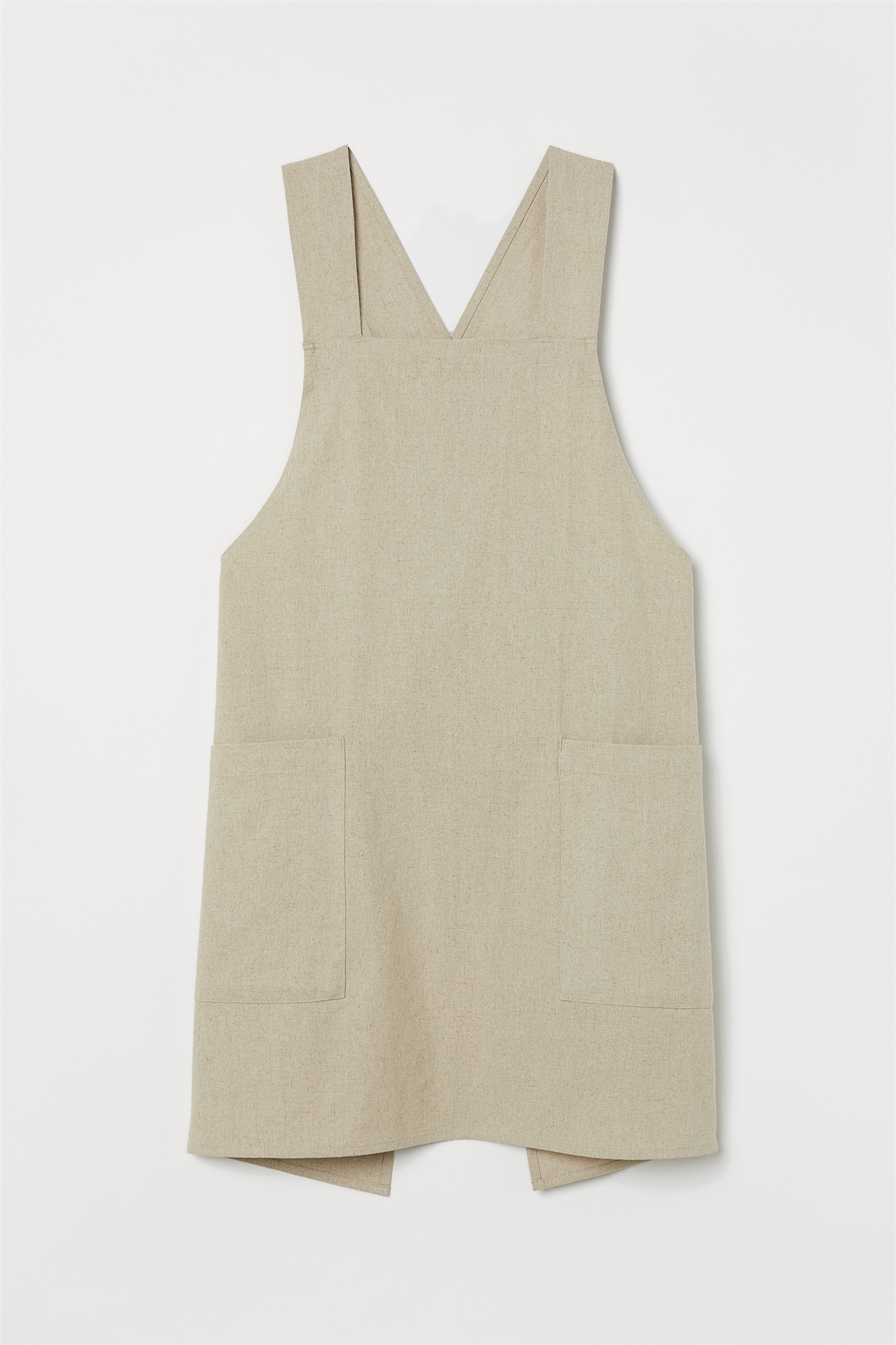 Фартук из льна и хлопка с широкими плечевыми лямками, перекрещивающимися сзади, и большими накладными карманами по бокам.
