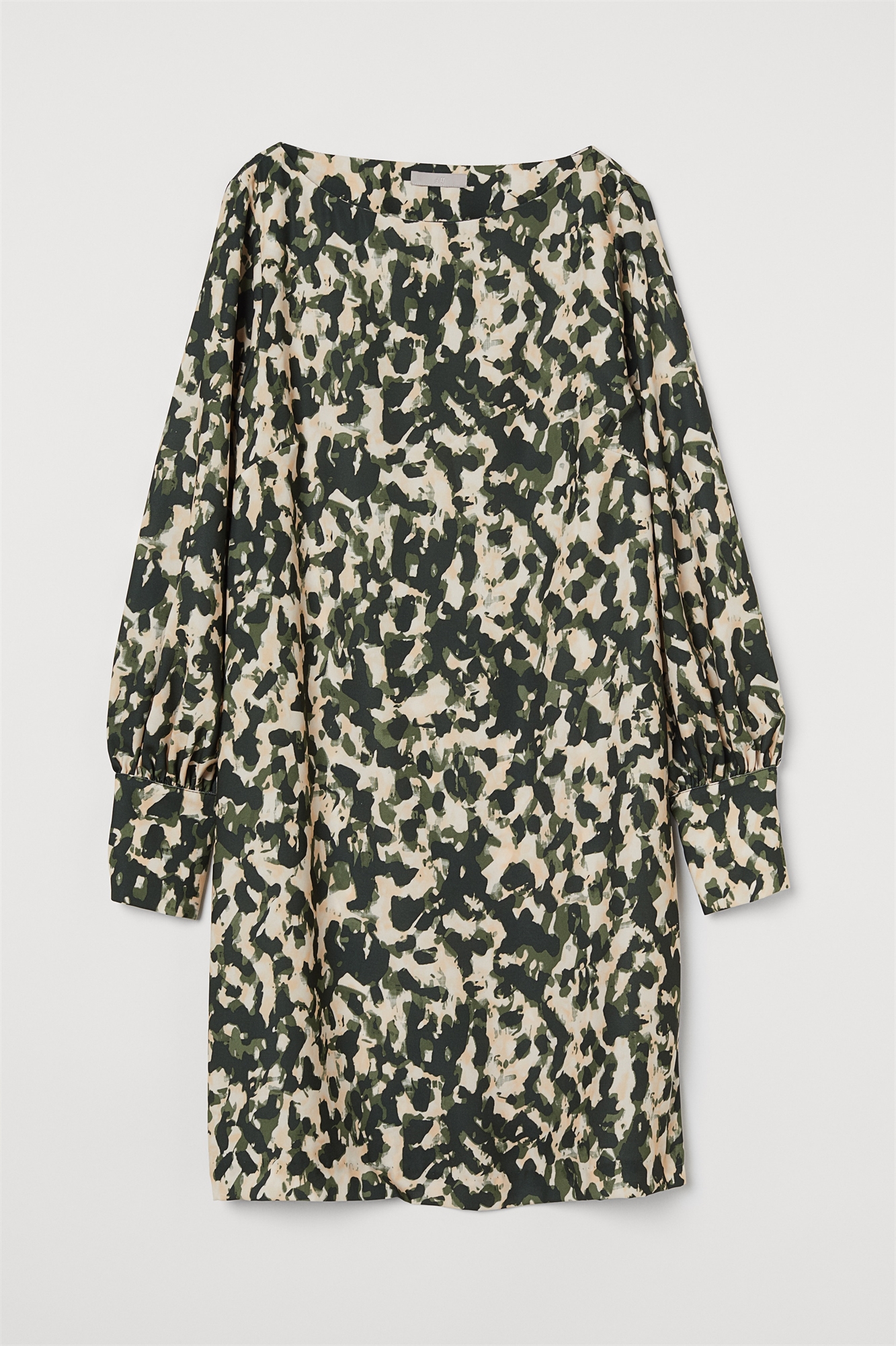 Короткое платье прямого кроя из атласа. Модель с вырезом-лодочкой, длинными широкими рукавами и широкими манжетами с круглыми металлическими пуговицами. Без подкладки.