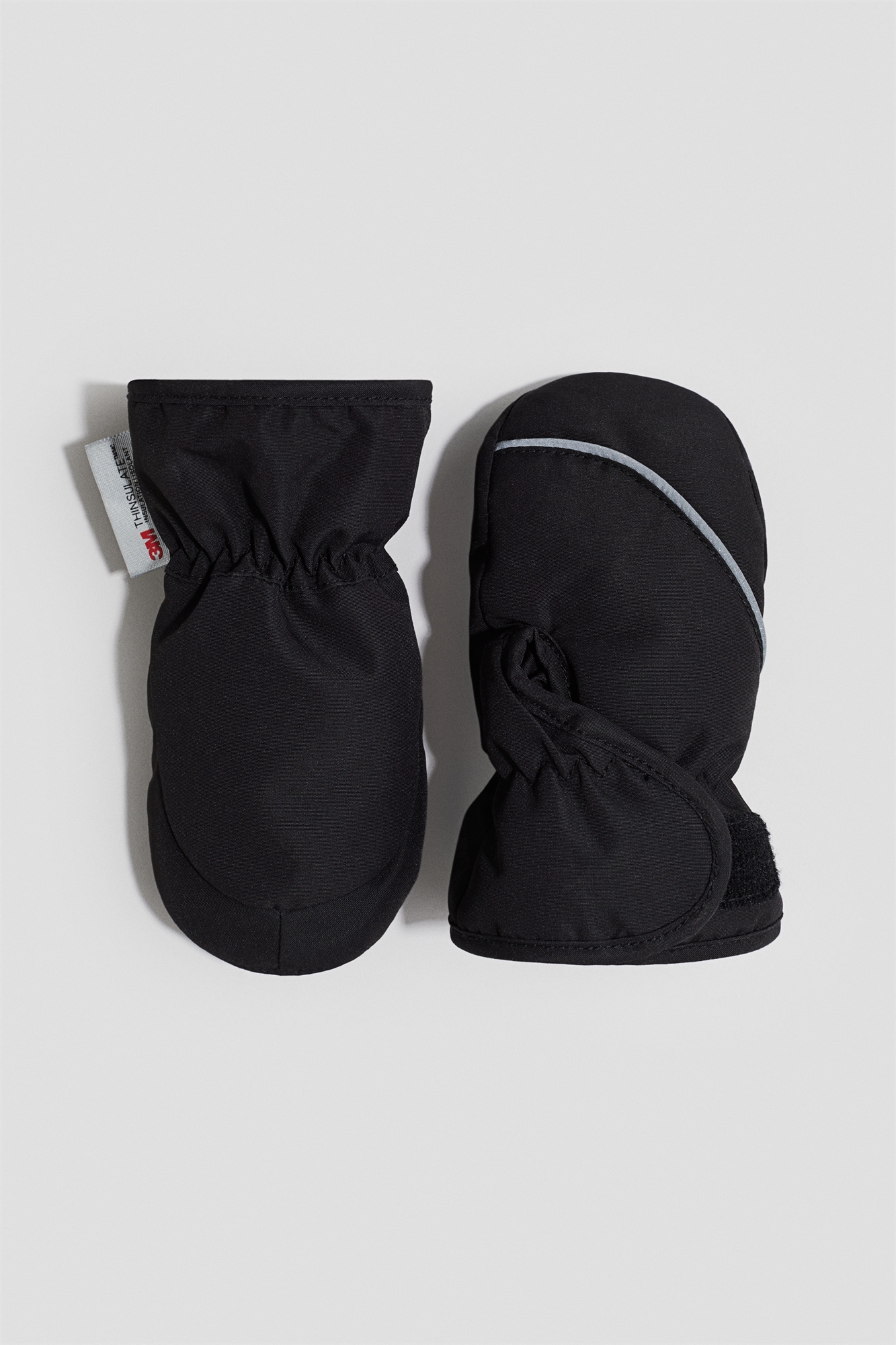 Варежки из ветрозащитной, водоотталкивающей функциональной ткани со светоотражающей отделкой на верхней части. Эластичная резинка на запястьях и застежка на крючок и петлю в верхней части. Мягкая подкладка Thinsulate™. Размер 2-6M без большого пальца. Варежки имеют водоотталкивающее покрытие без фторуглеродов.
