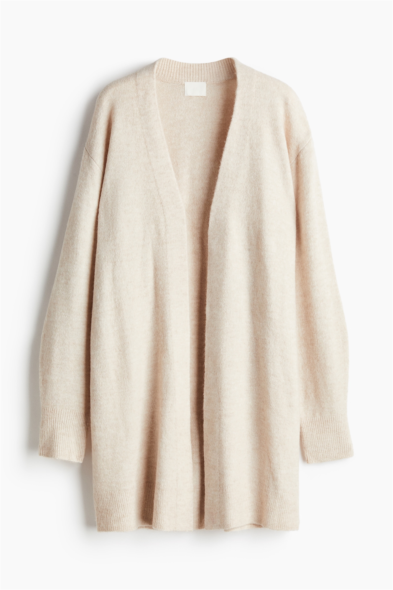 Длинный кардиган из мягкого тонкого трикотажа с добавлением шерсти, с опущенными плечами, длинными рукавами и окантовкой на манжетах, подоле и задней части горловины. Без пуговиц.