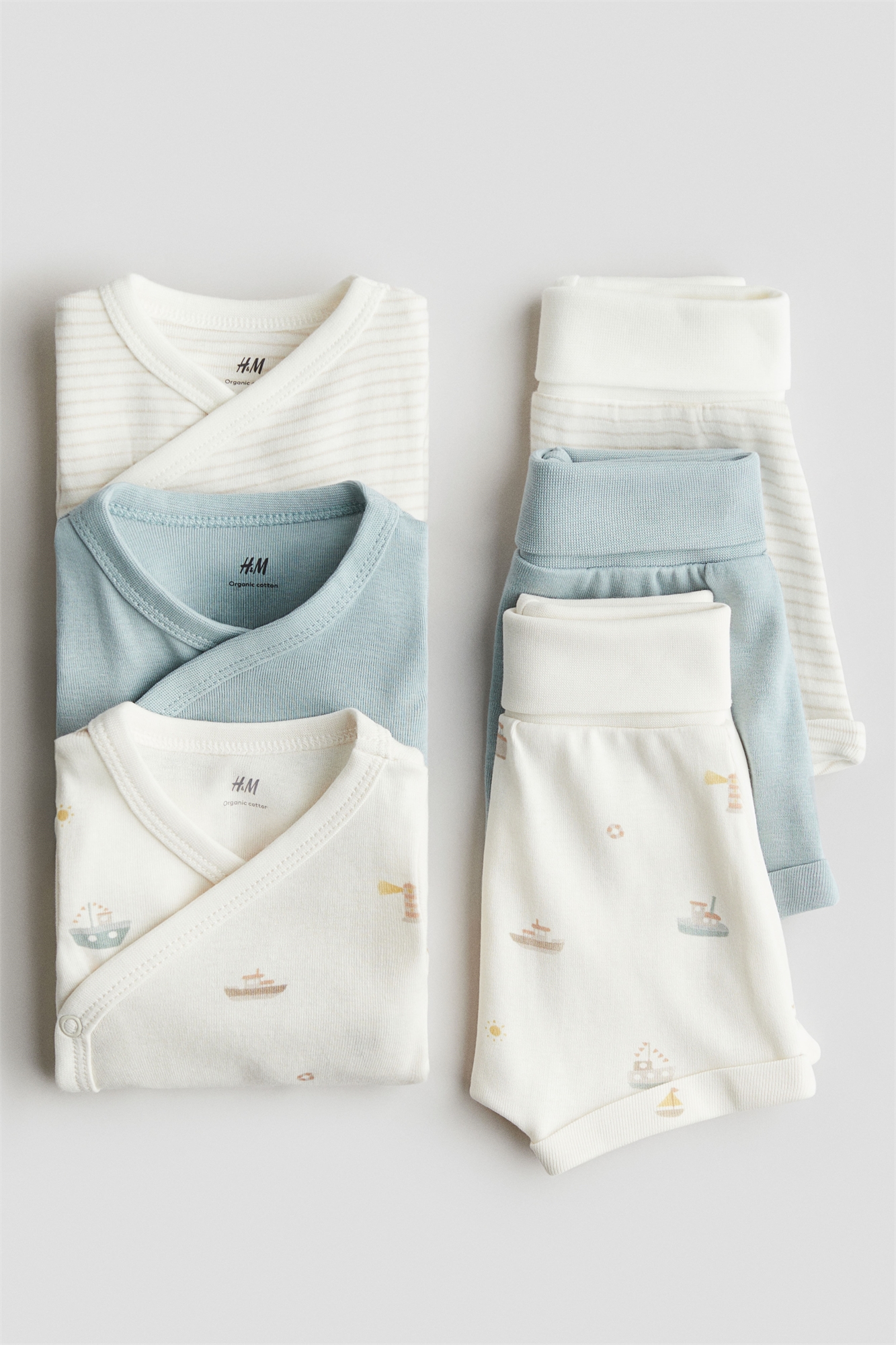 Комплект из трех комбинезонов и трех пар шорт из мягкого хлопкового джерси. Боди с короткими рукавами, облегающий перед, с застежками по бокам и в промежности. Шорты с эластичной талией.