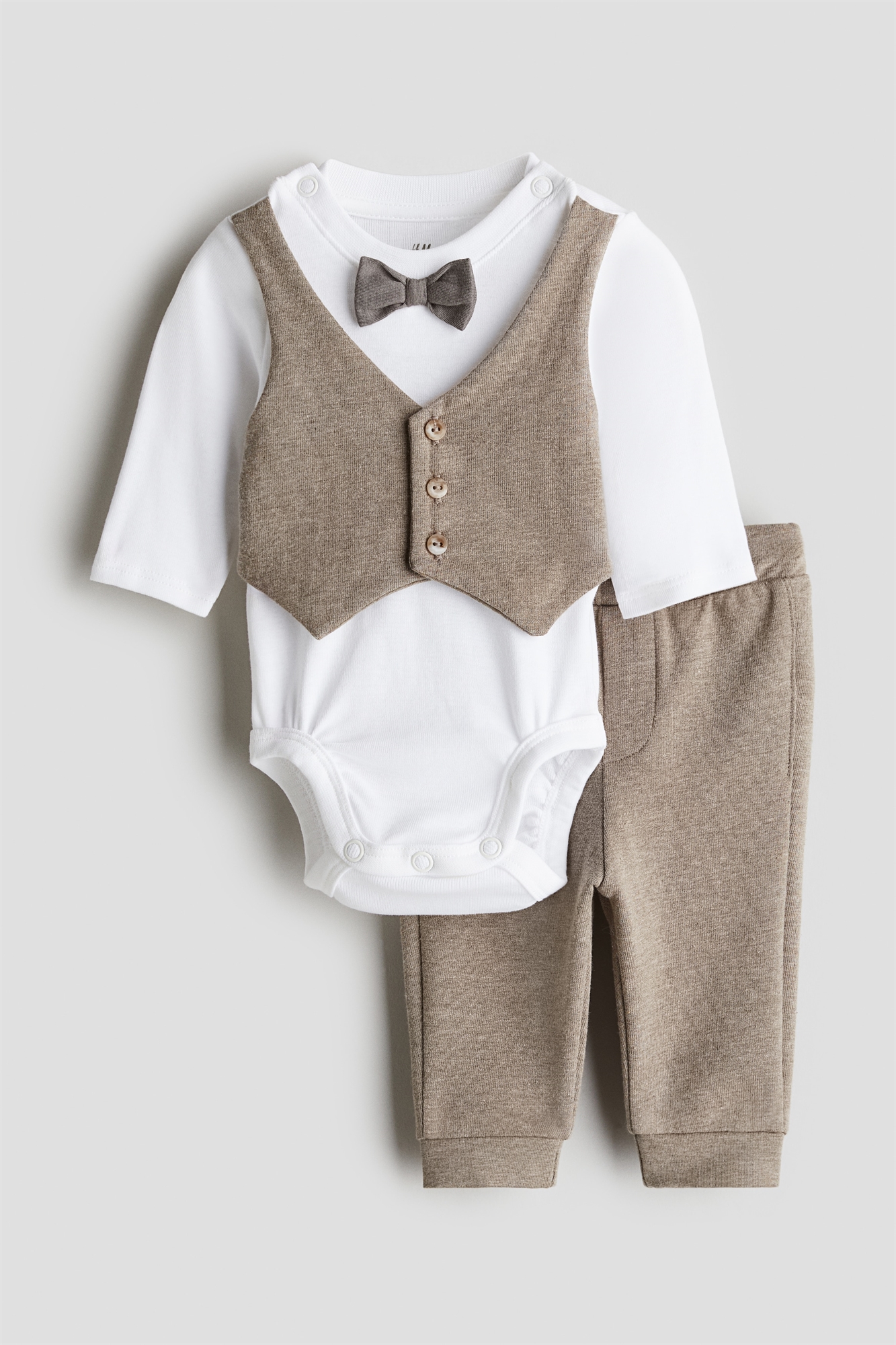 Нарядный комплект из комбинезона и брюк из мягкого хлопка. Боди с длинными рукавами из мягкого трикотажа с пришитым поясом-футляром из легкой толстовочной ткани с декоративными пуговицами. Круглый вырез с фиксированной завязкой-бабочкой и застежками на плечах и внизу для удобства переодевания. Сборчатые швы вокруг ножек для более удобного и плотного прилегания подгузника. Брюки из легкой толстоватой ткани с эластичной талией, фальшивой ширинкой и манжетами по краям.
