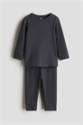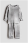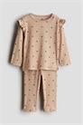 Комплект из топа с длинными рукавами и брюк из мягкого ребристого хлопкового джерси. Топ со скрытой застежкой на одном плече (кроме размеров 2-4Y) и ребристыми манжетами. Брюки с утяжкой на талии и ребристыми манжетами.