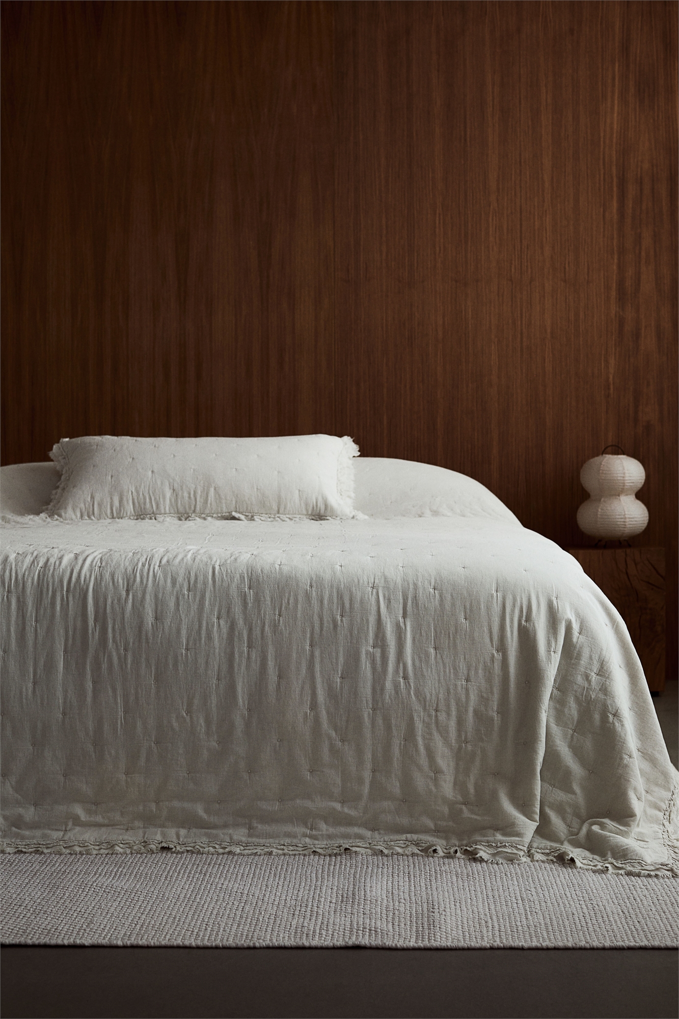 Двуспальное покрывало с легкой подкладкой из стеганого хлопкового полотна с необработанной оборкой по краю.