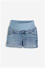 Шорты из эластичного денима с фальшивой ширинкой, фальшивыми передними карманами, настоящими задними карманами и вшитыми подворотами по краям. Широкая панель из джерси на талии для лучшей посадки на животе. Хлопок, из которого изготовлены шорты, частично переработан.