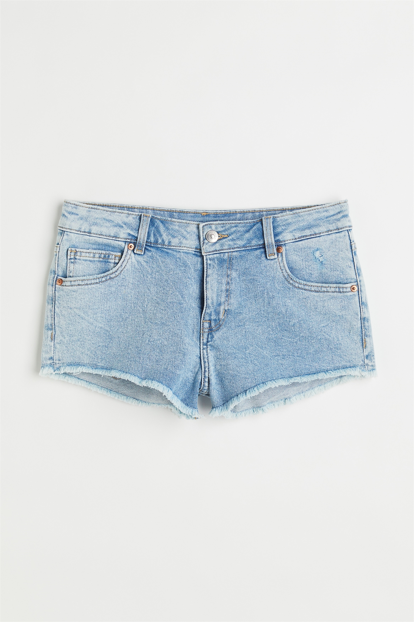 Шорты с 5 карманами из стираного хлопкового денима с заниженной талией, ширинкой на молнии и пуговице и необработанными краями.