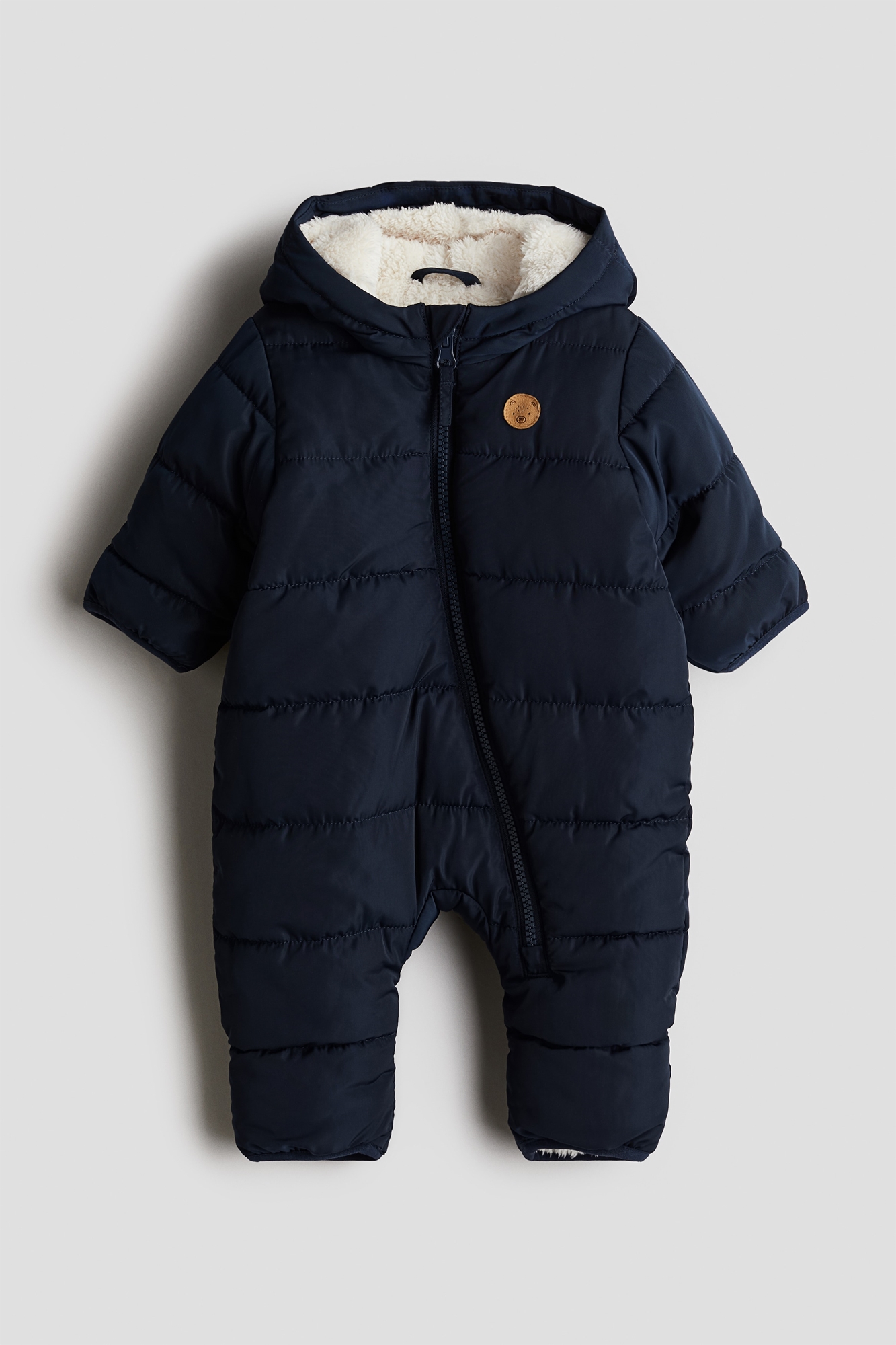 Зимний костюм с мягкой подкладкой из тканого материала с мягким ворсом. Капюшон с ушками и застежкой-молнией спереди, которая продолжается по одной штанине и имеет защиту подбородка сверху. Откидные варежки на манжетах и откидные ножки на подоле, чтобы держать руки и ноги в тепле.