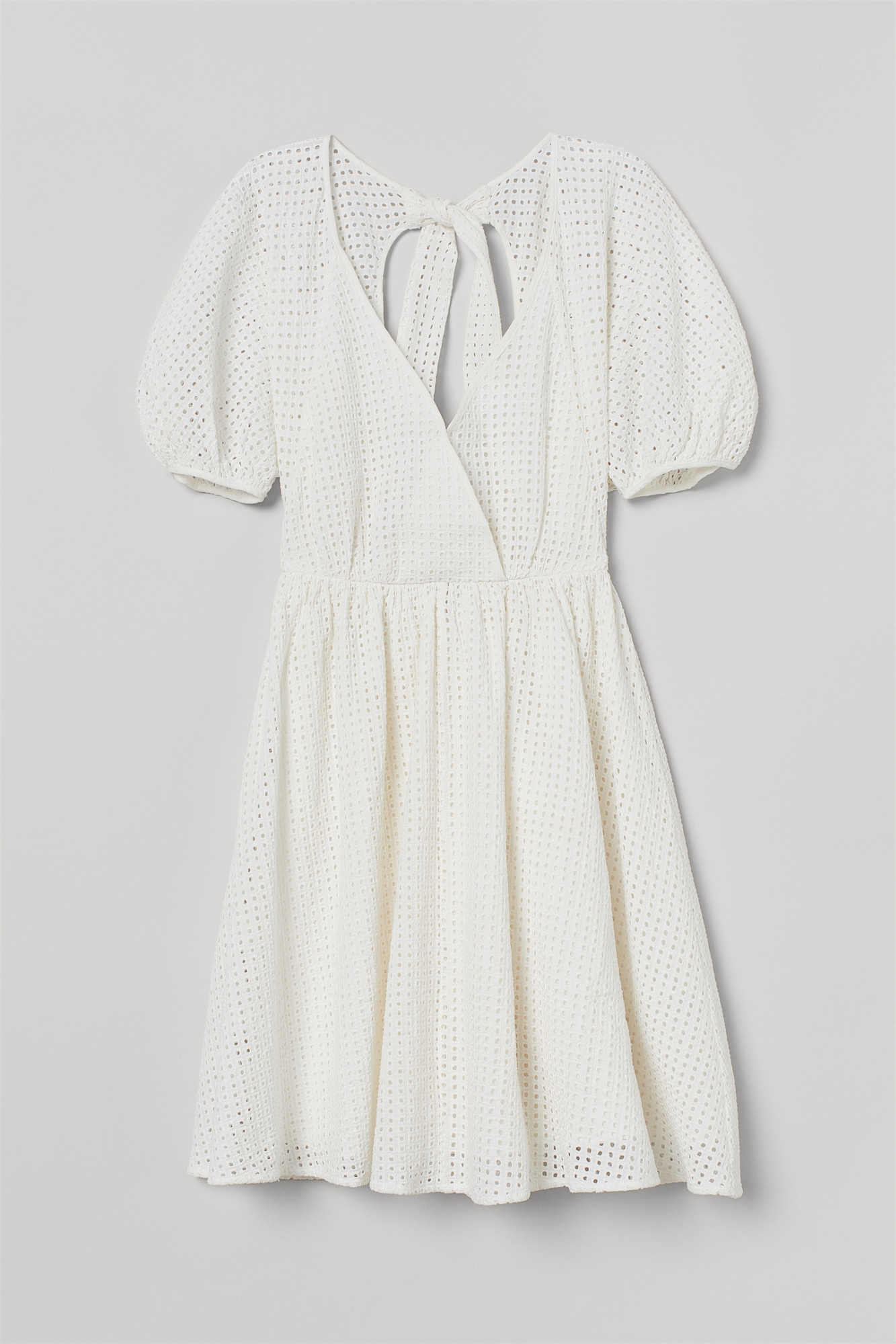 Короткое платье из воздушной фактурной ткани. Фасон без спинки, с накладной передней частью и широкими завязками на затылке. Короткие объемные рукава-пышки с эластичными манжетами. Присборенный шов на талии с эластичным шнурком сзади. На подкладке.