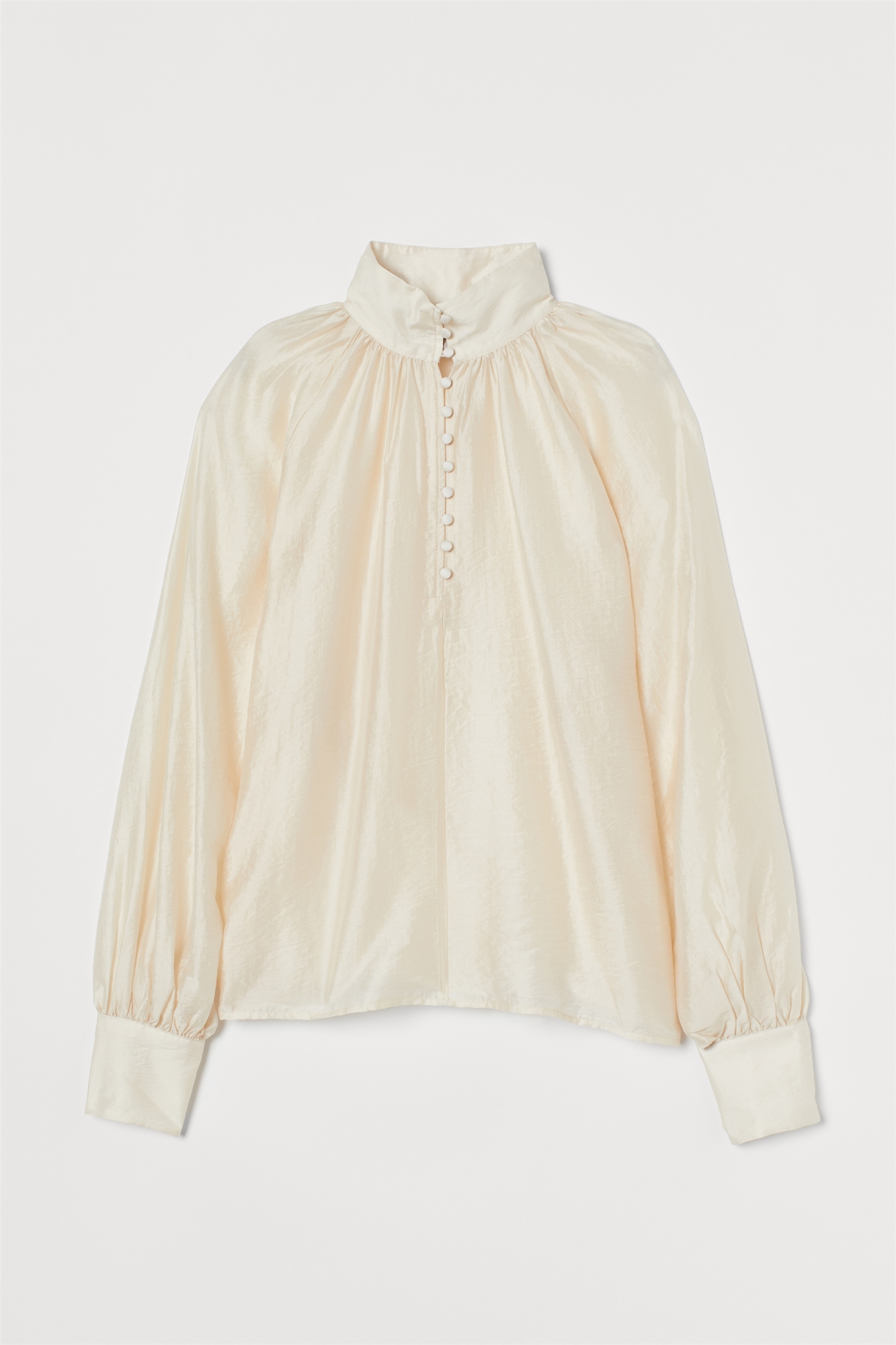 Мягкая, струящаяся атласная блузка из смеси лиоцелла Tencel™. Блузка имеет высокий воротник и застежку на пуговицы с закрытыми пуговицами в верхней части. Длинные рукава-баллоны с широкими манжетами на пуговицах. Сборки у выреза горловины и на концах рукавов создают объем и красивую драпировку.