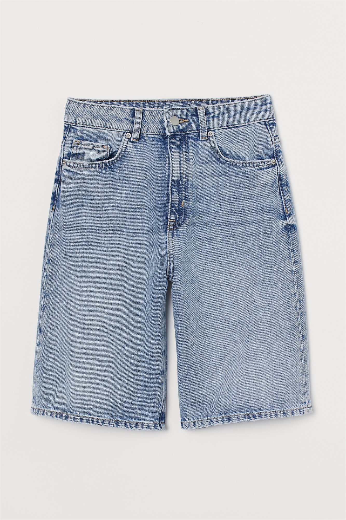 Шорты длиной до колена с 5 карманами из хлопкового денима. Модель с высоким поясом и прямыми широкими штанинами. Застежка на молнию и пуговицу спереди.