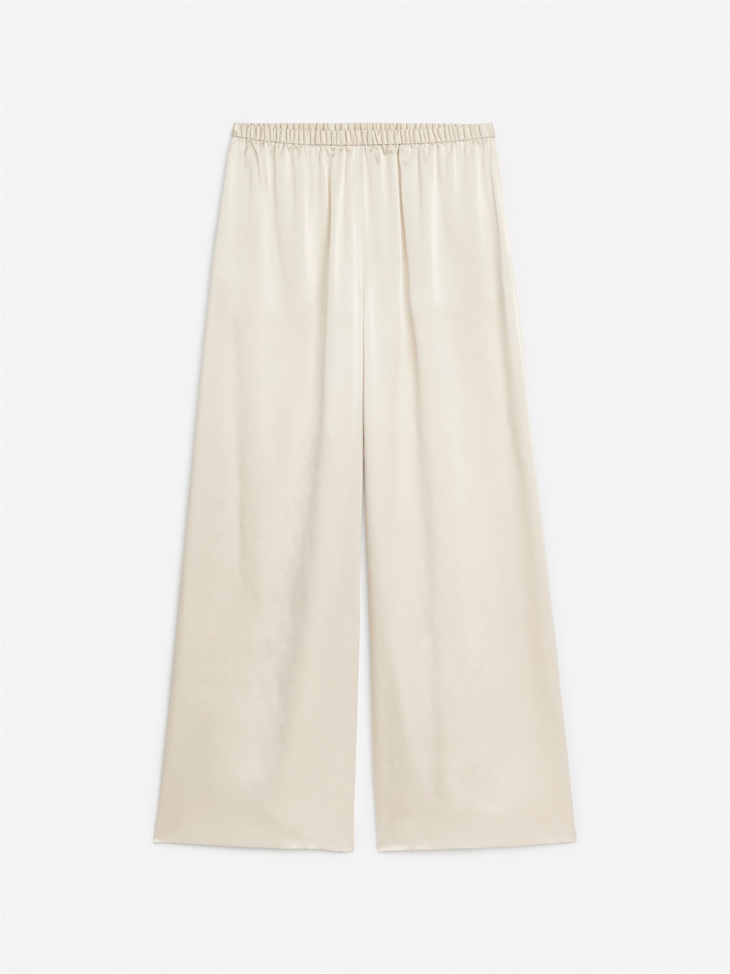 Гладкое атласное переплетение шелка тутового дерева придает роскошный вид этим пижамным брюкам. Фасон с высокой талией и широкими штанинами обеспечивает непринужденную и комфортную посадку. Эластичная талия и карманы в боковых швах. Сопутствующая рубашка в наличии